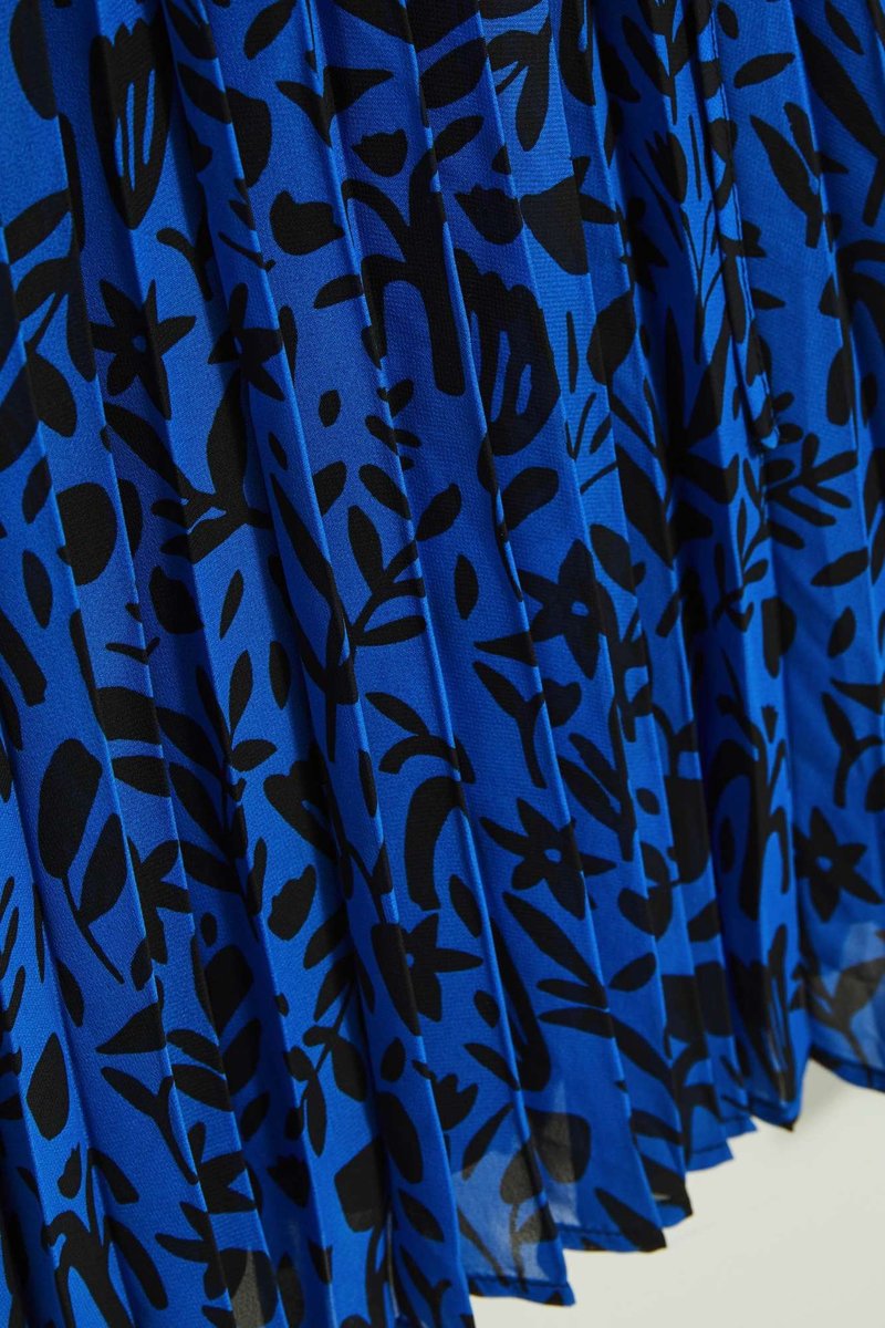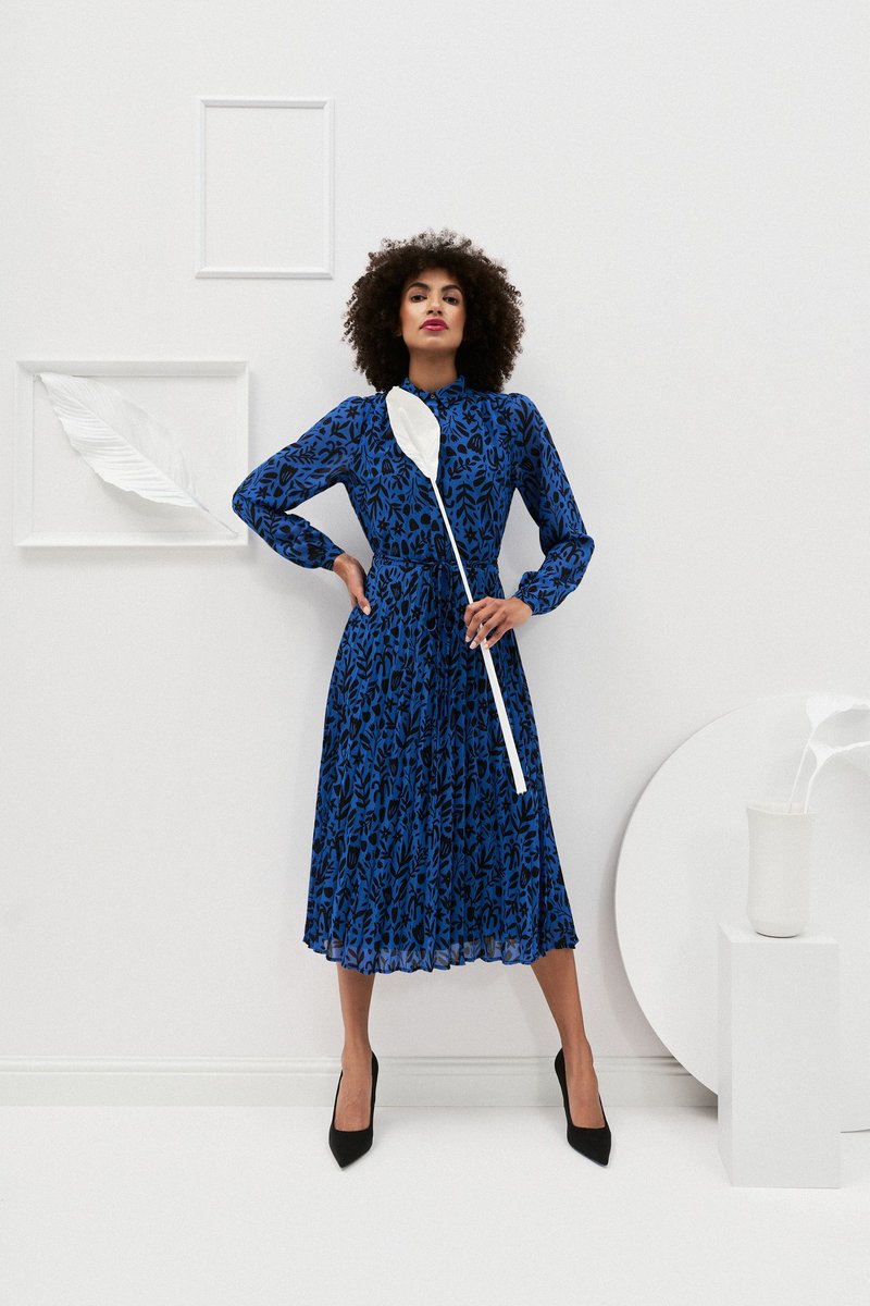 100%POLIESTER Elegancka, oryginalna, damska sukienka. Uszyta w przepięknym błękitnym kolorze. Ozdobiona na całości czarnymi kwiatami i liśćmi. Dekolt z klasycznym, wykładanym kołnierzykiem. Góra zapinana na guziki ukryte pod plisą. W talii wszyta elastyczna gumka. W pasie przewiązany cienki, materiałowy pasek. Od połowy w dół sukienka jest rozkloszowana, plisowana i zwiewna. Długość midi. Cała sukienka na jednobarwnej podszewce. Sukienka pięknie układająca się w ruchu. Długie, przezroczyste, bufiaste rękawy zebrane w mankiet zapinany na drobny guzik. Idealna na elegancką kolację bądź ważne spotkanie.