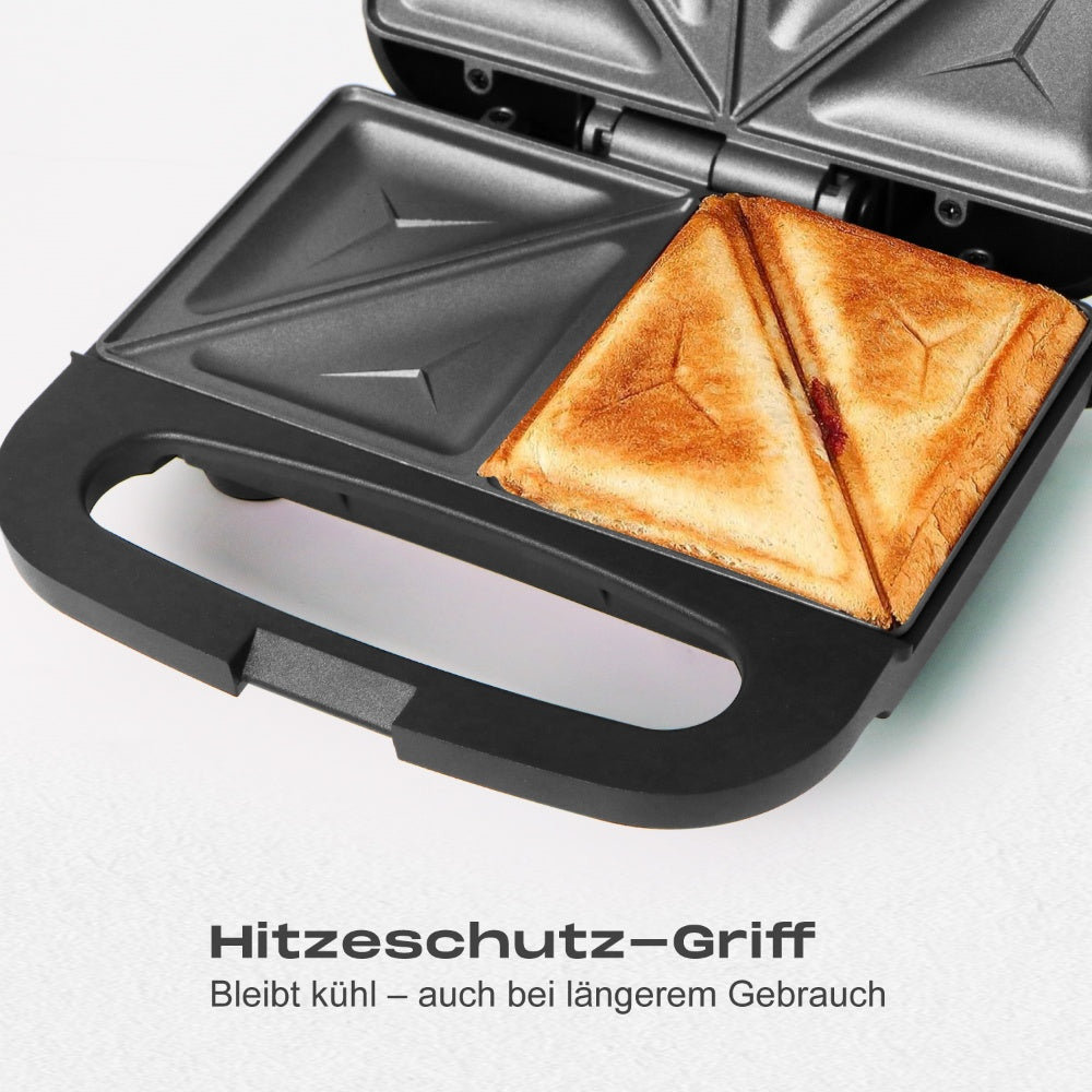 Rączka chłodząca wykonana z materiału odpornego na wysoką temperaturę i antypoślizgowa podstawka. Wskaźnik LED (gotowość do użycia/nagrzanie) pokazuje dokładnie, kiedy grill kanapkowy osiągnął optymalną temperaturę do przygotowania chrupiących trójkątnych tostów lub placków.