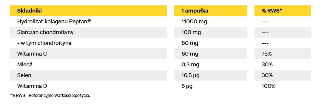 Suplement diety - Zawiera cukier i substancje słodzące ZDROWE KOŚCI + SPRAWNE STAWY (CHRZĄSTKI)1 Wspiera prawidłowe funkcjonowanie chrząstki, kości, tkanek łącznych2 Aż 11000 mg płynnego kolagenu ...