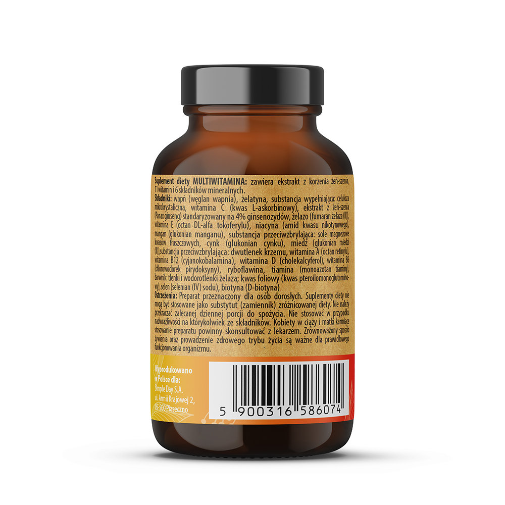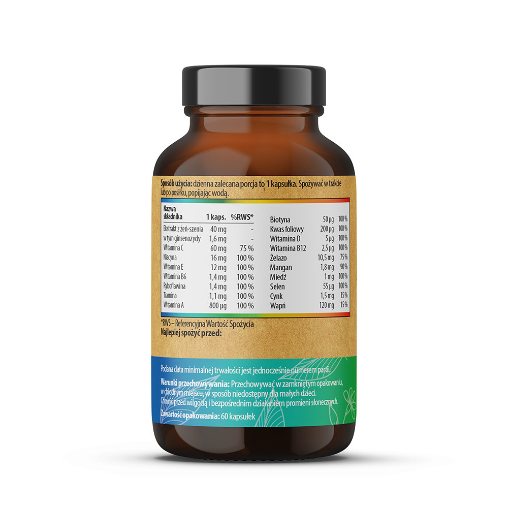 Pełen zestaw witamin i minerałów, bez zbędnych dodatków. Zawiera m.in. wapń, żelazo, witaminę C, ekstrakt z żeń-szenia i wiele innych, wszystko w optymalnych dawkach dla Twojego zdrowia.