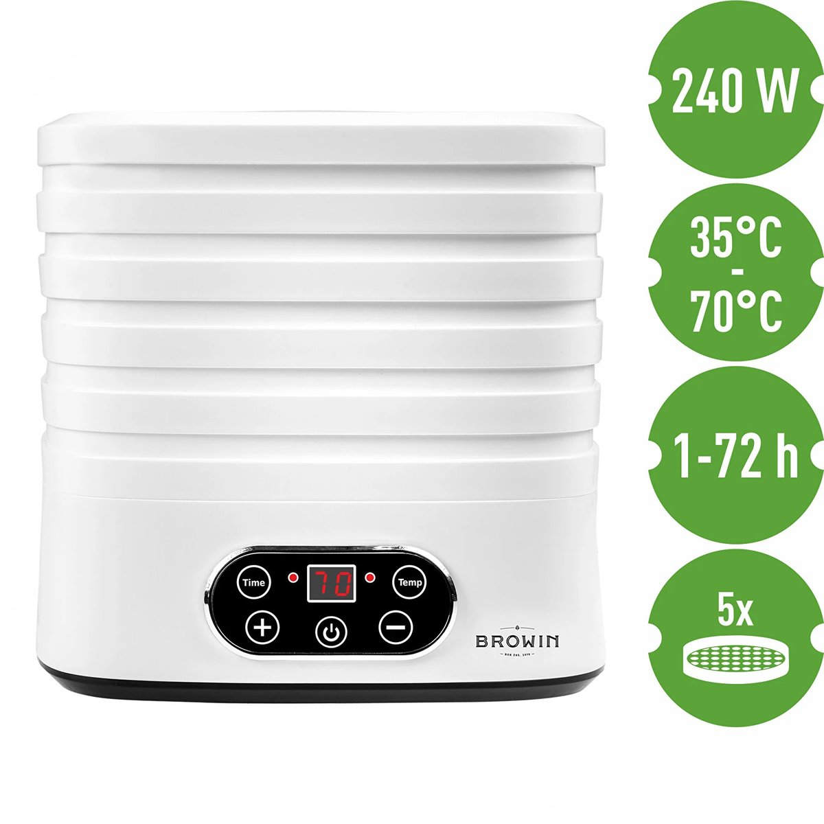 Możliwość regulacji temperatury - zakres od 35℃ do 70℃ (co 5℃) i czasu suszenia - zakres od 1 do 72 godzin na panelu sterowania.