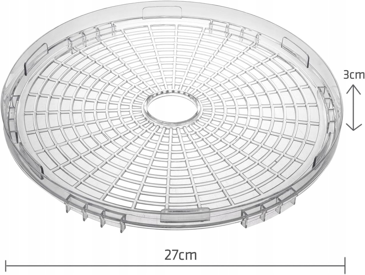 - pięć przezroczystych sitek o średnicy 27 cm. Sitka zapewniają wystarczająco dużo miejsca do suszenia różnych produktów spożywczych