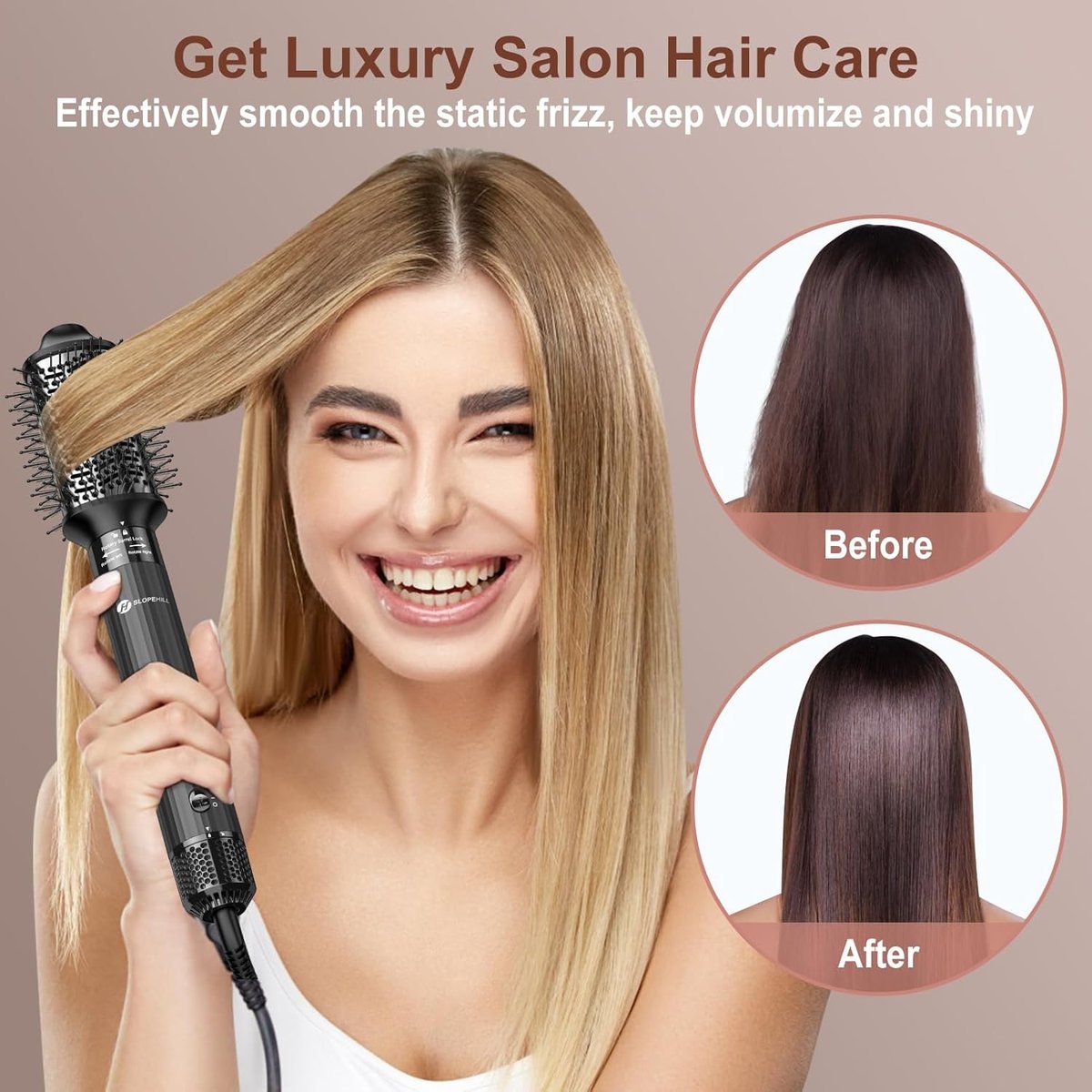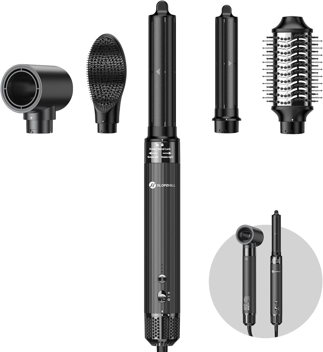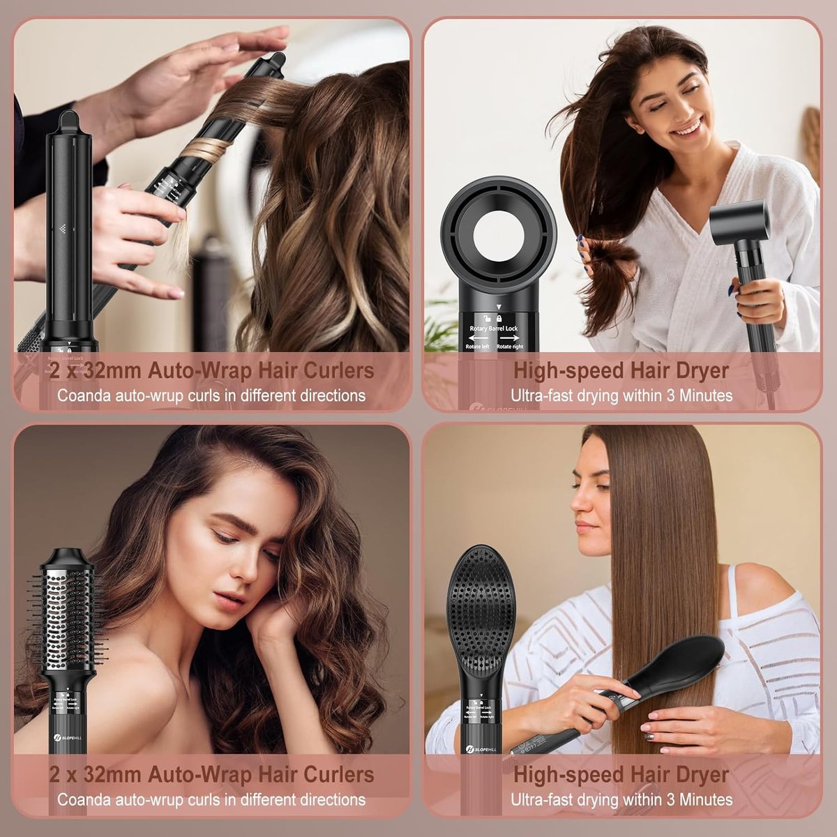 [Zestaw do stylizacji włosów 5 w 1] Nasz slopehill Airstyler idealnie spełni Twoje różnorodne potrzeby związane z stylizacją. Zawiera 1 x suszarkę do włosów do szybkiego suszenia, 2 x 32 mm left & right automatyczna lokówka do lokowania, 1 x szczotka do zwiększania objętości, 1 x prostownica do włosów szczotka do prostowania i masażu. Łączy w sobie suszenie, wygładzanie, lokowanie i objętość w jednym narzędziu, oszczędza czas i pieniądze.
