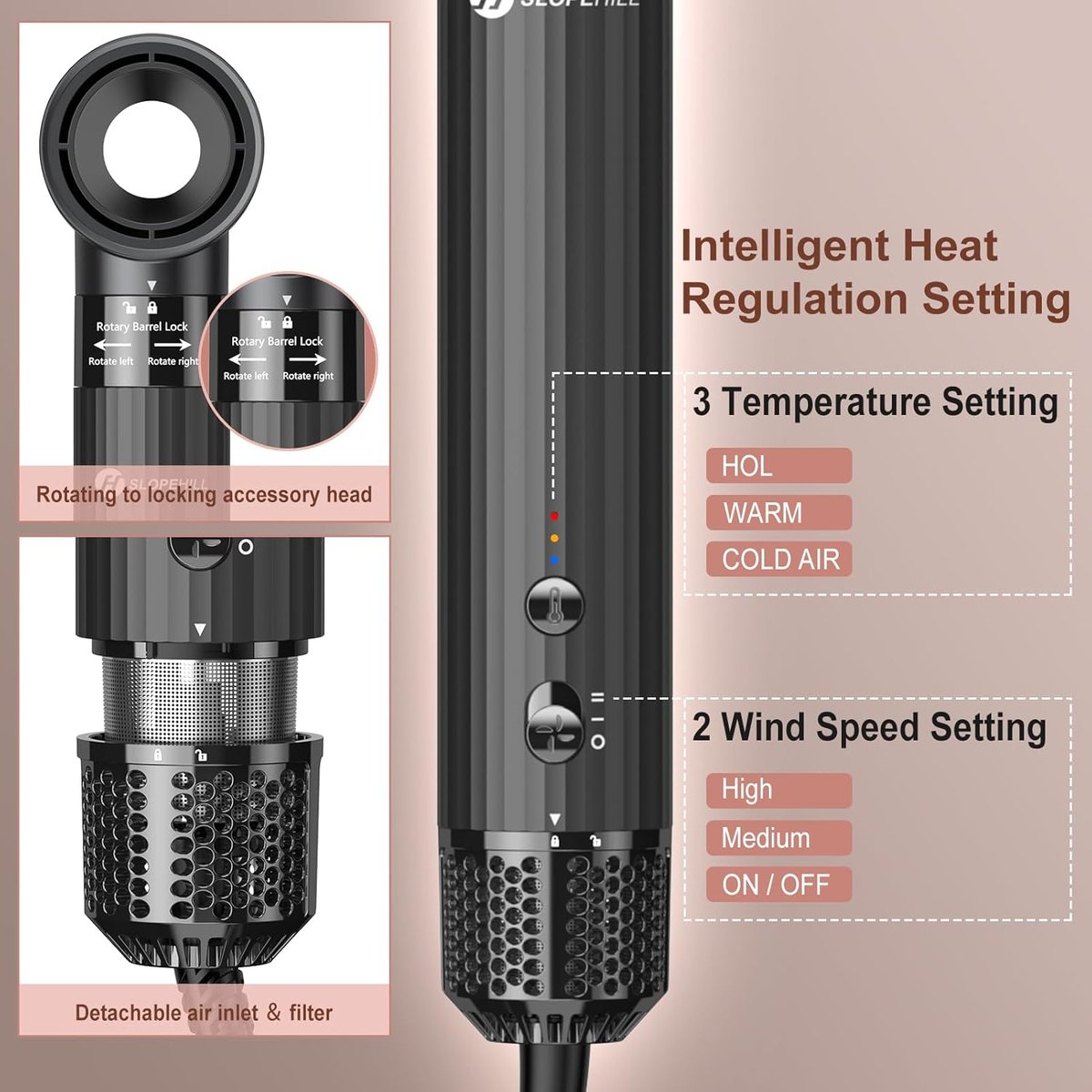 [Inteligentna regulacja ciepła] 3 temperatury (zimno-ciepło-gorące) + 2 prędkości nawiewu (średnio-wysokie). Dzięki regulacji temperatury można wybrać optymalną, aby spełnić potrzeby różnych rodzajów włosów i efektów stylizacji.