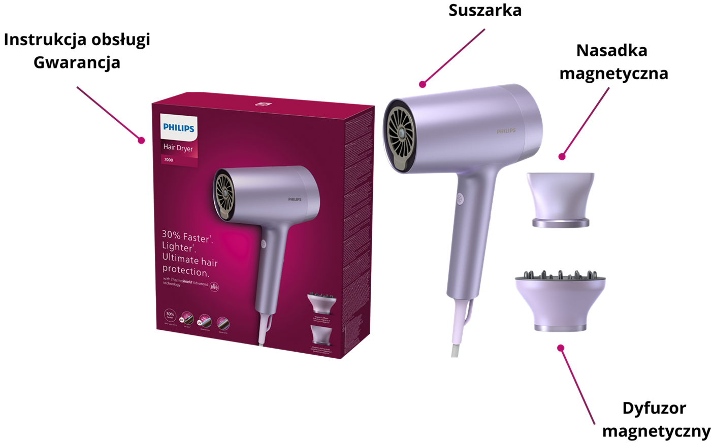 Wzmacnia blask włosów. Chroni je przed przegrzaniem. Profesjonalne rezultaty zauważysz błyskawicznie! Idealne połączenie mocy suszenia i stylizacji. Ułóż włosy tak, jak lubisz, bez martwienia się o bezpieczeństwo Twoich włosów.