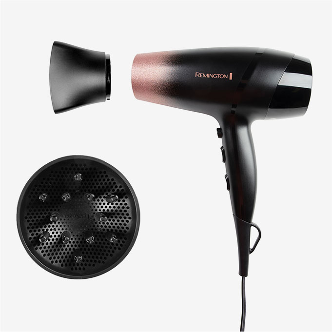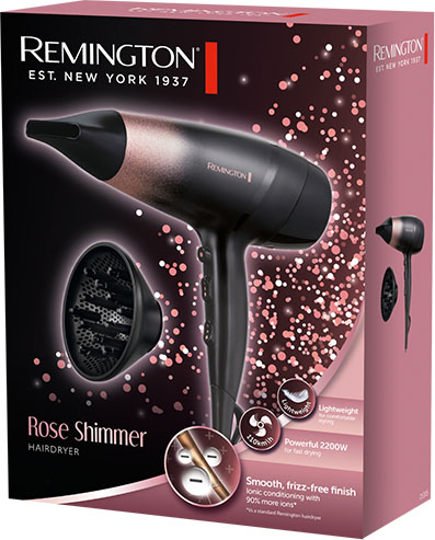 Przygotuj się na stylizację włosów stylową i wydajną suszarką Remington Rose Shimmer. Dzięki odżywieniu jonowemu, które z każdym podmuchem powietrza uwalnia o 90% więcej* jonów ujemnych, wyeliminujesz problem puszących się pasm. Suszarka Rose Shimmer zaoferuje Ci także wszystkie funkcje, których potrzebujesz do szybkiego uzyskania pożądanych efektów stylizacji – niezależnie od tego, jaki rodzaj włosów posiadasz.