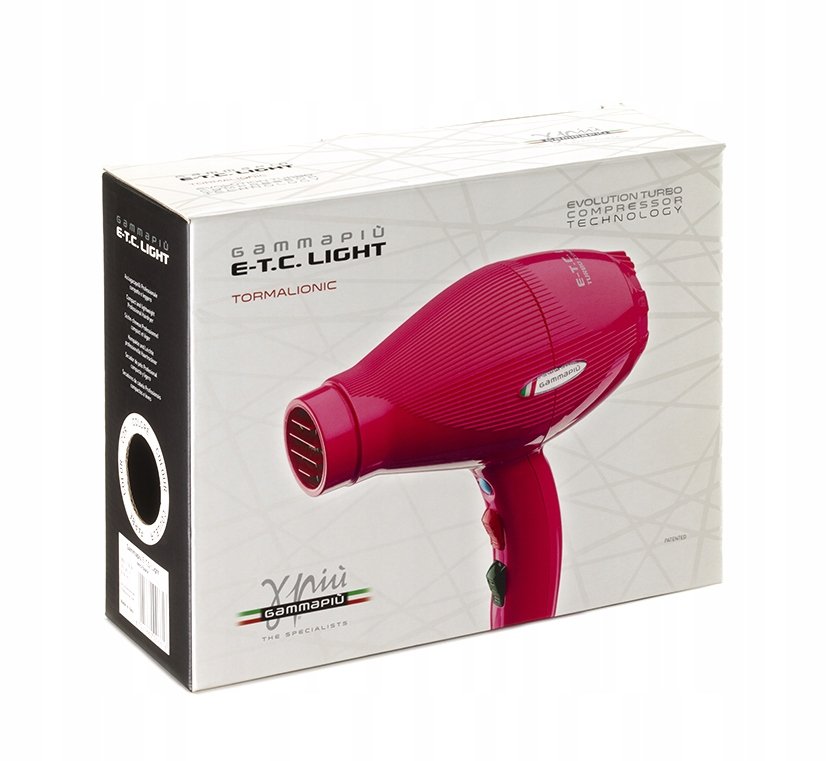 Gamma Più E-T.C. Light Premium to idealna gama, kompaktowych, lekkich i mocnych suszarek w wielu kolorach. Urządzenie zostało wyposażone w technologię Evolution Turbo Compressor, która zwiększa ciśnienie i prędkość powietrza w kontakcie ze szczotką. Ponadto technologia E-T.C. przenika głębiej do wnętrza włosa, aby uzyskać pierwsze tego typu hiperszybkie suszenie.