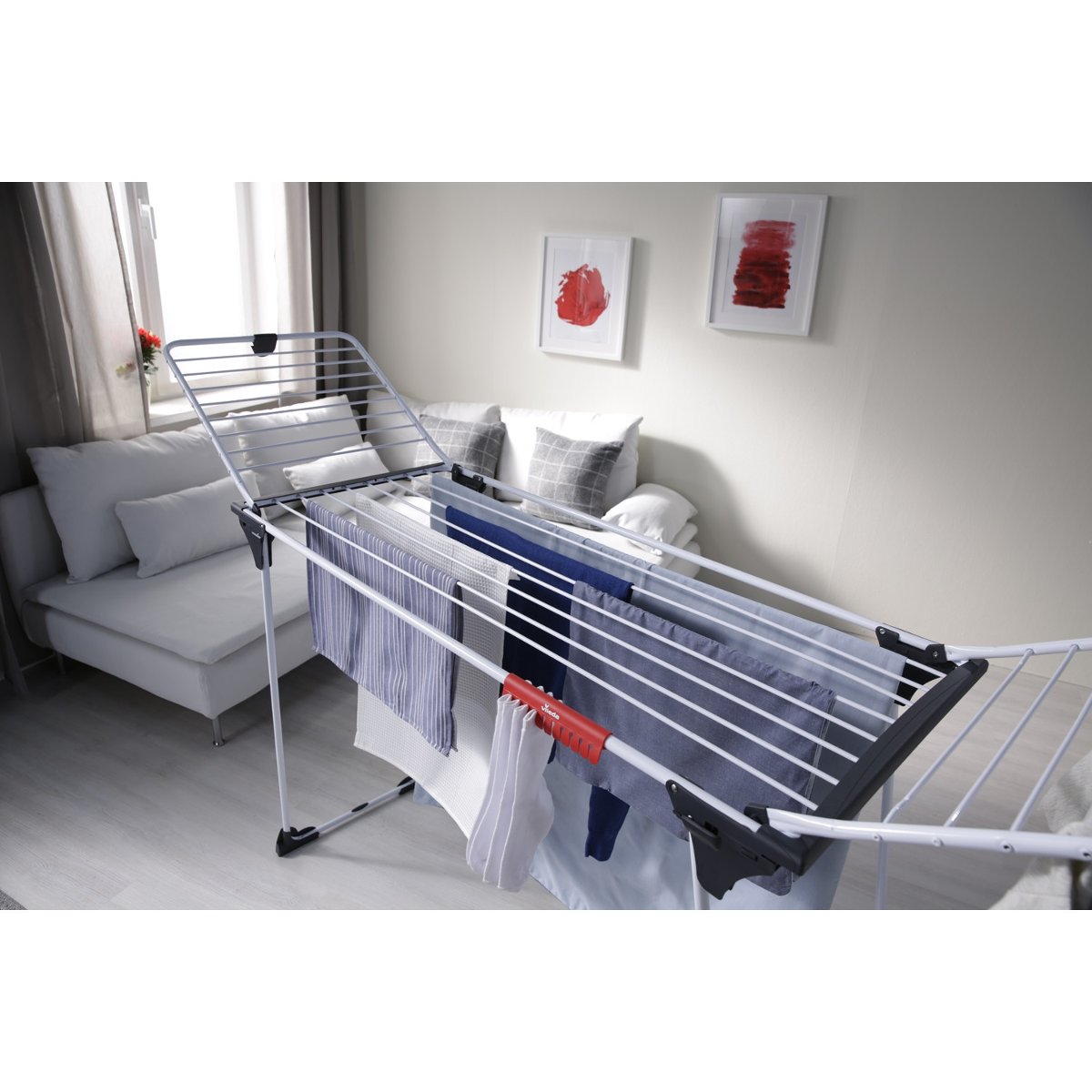 Podwyższony stelaż suszarki na bieliznę pozwala na suszenie długich rzeczy, np. spodni czy sukienek.