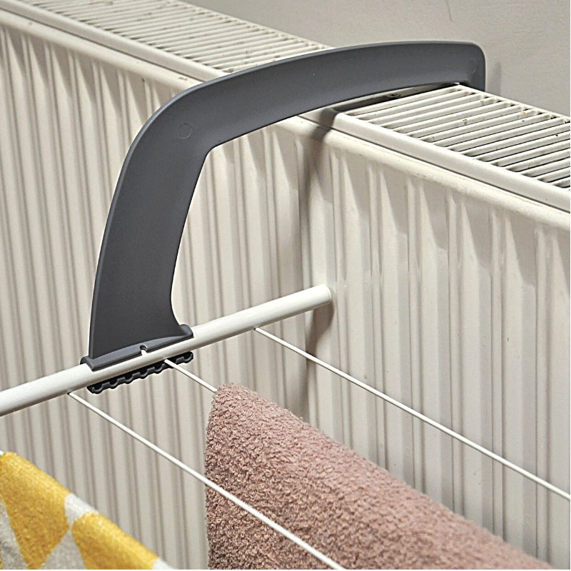 Uniwersalne Uchwyty: Nasza suszarka została zaprojektowana z myślą o różnych typach standardowych grzejników, o różnej grubości. Plastikowe, regulowane uchwyty, w szarym kolorze, pozwalają na łatwe zamocowanie na kaloryferze, gwarantując stabilność.