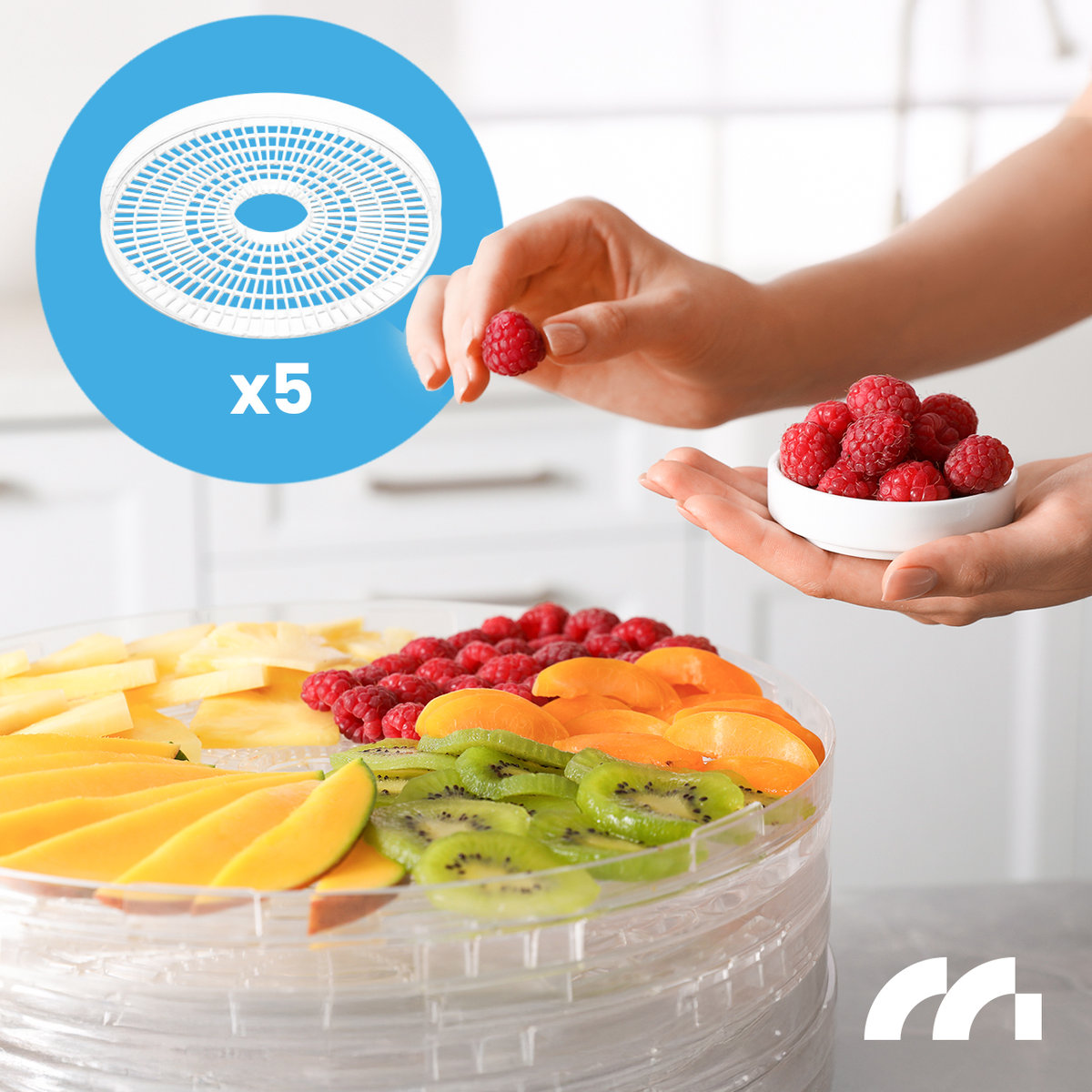 5 wysokich tacek (45 mm), z opcją rozbudowy – suszenie dużej ilości żywności jednocześnie.