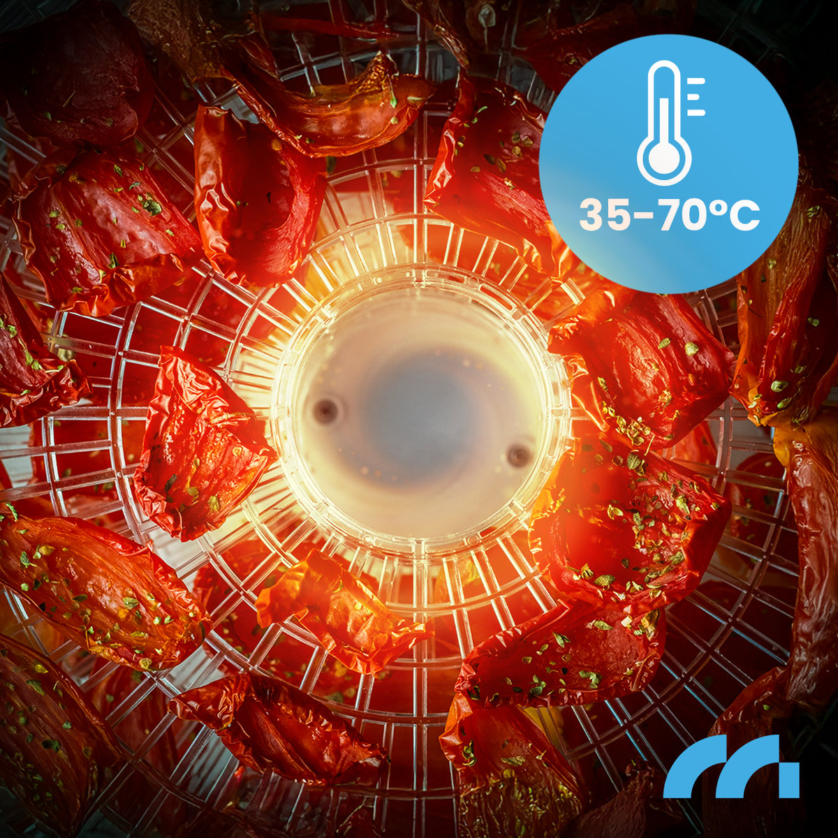 REGULACJA TEMPERATURY – 8-stopniowa skala w zakresie od 35°C do 70°C pozwala dostosować parametry suszenia do rodzaju żywności