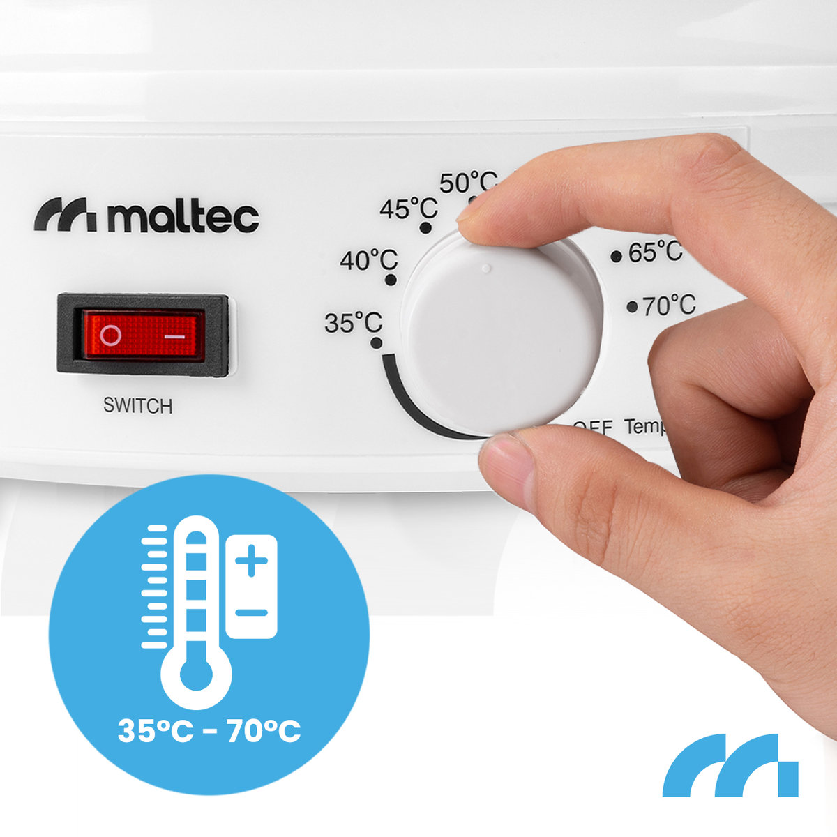 Obsługa suszarki jest niezwykle prosta – wystarczy jeden przełącznik oraz wygodne pokrętło temperatury, aby w pełni kontrolować proces suszenia. Dzięki manualnej, 8-stopniowej regulacji temperatury w zakresie od 35°C do 70°C, z łatwością dostosujesz warunki pracy urządzenia do rodzaju suszonych produktów – od delikatnych ziół po soczyste owoce i warzywa.