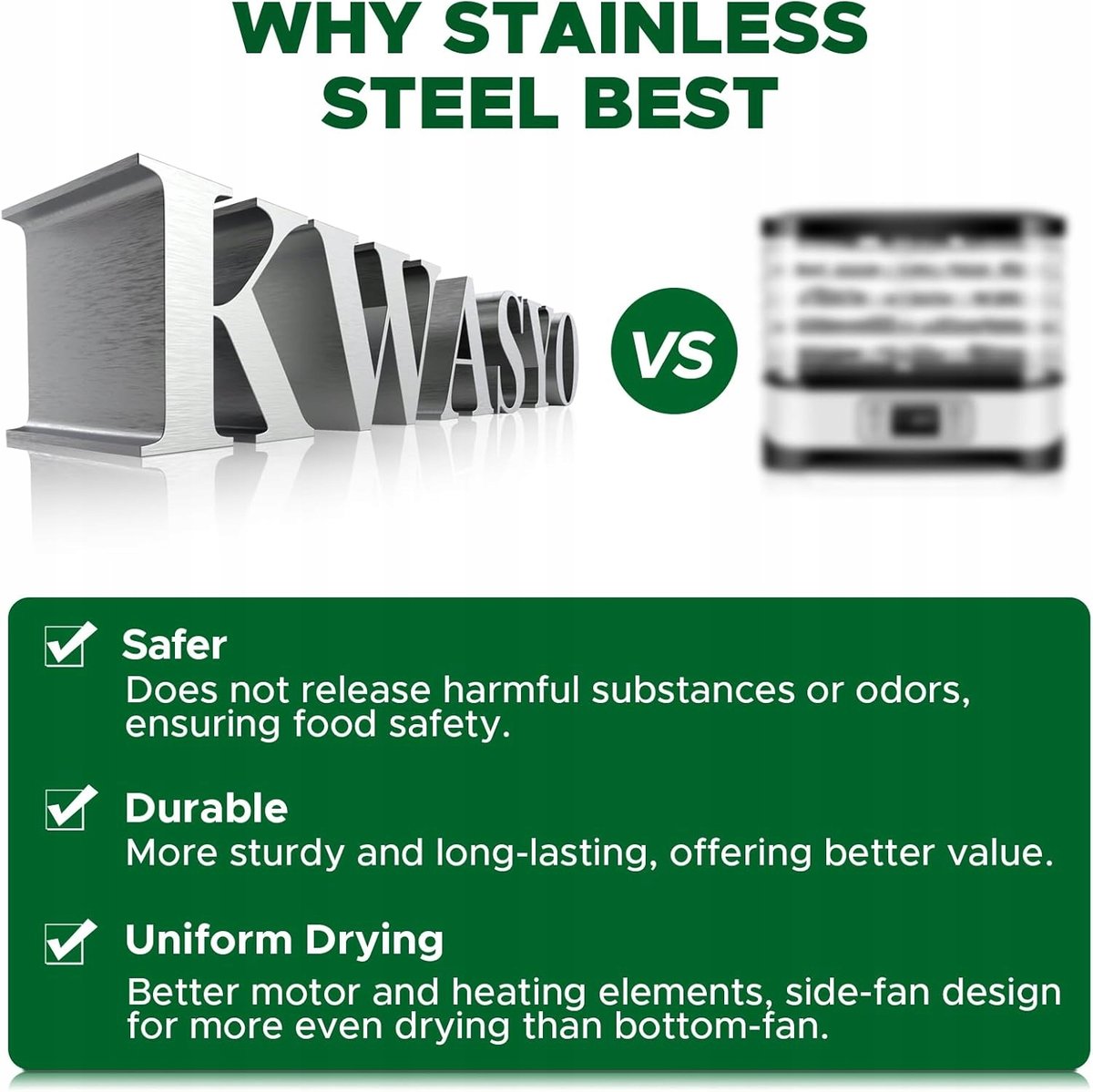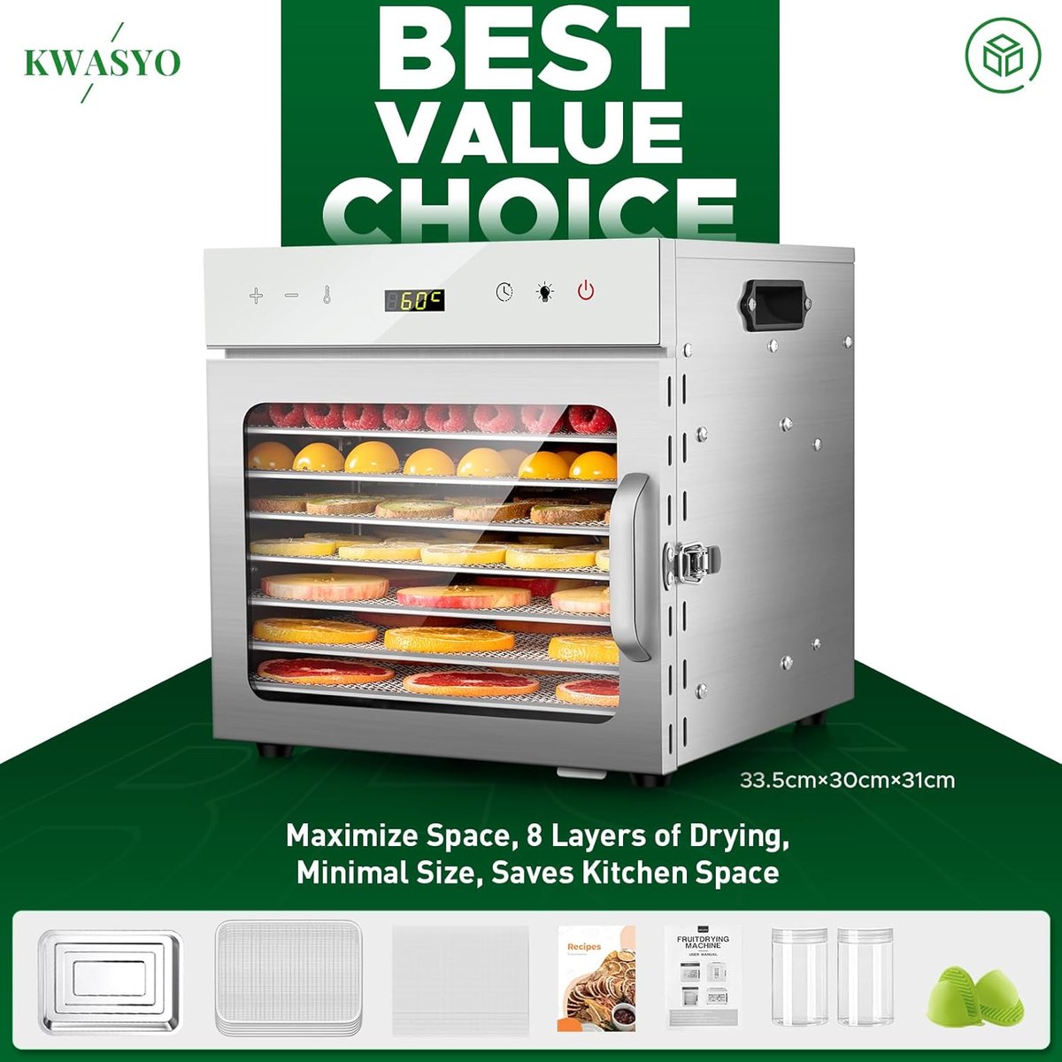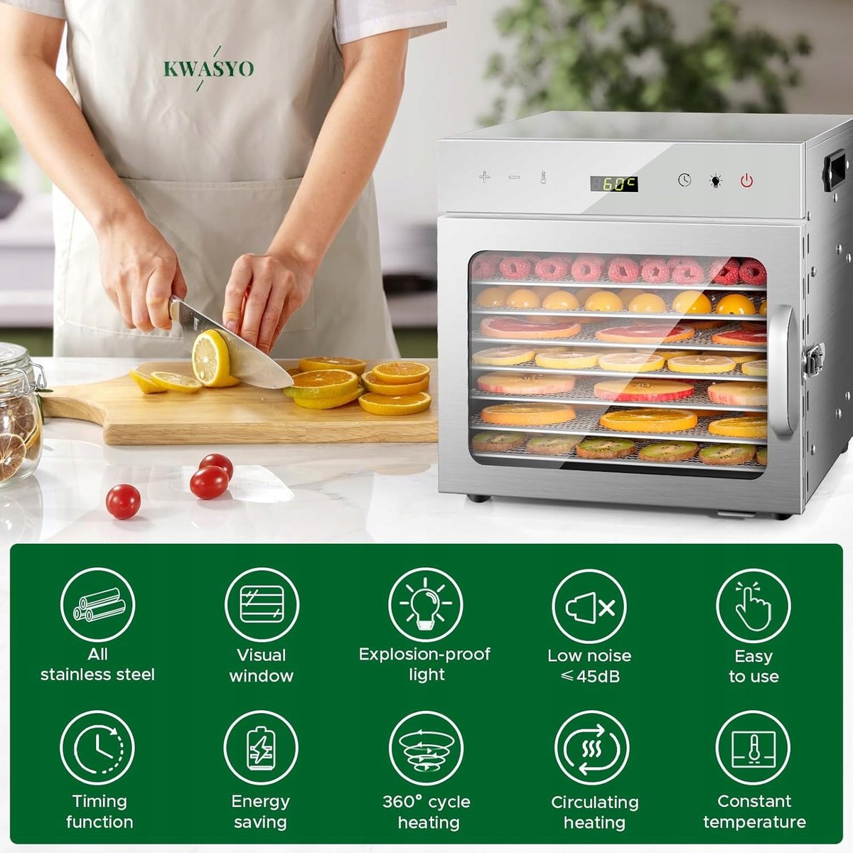 Kwasyo Suszarka do Żywności ze Stali Nierdzewnej – 8 Poziomów, 6 Foliowych Tac, Regulacja 30–90°C, Timer 24h