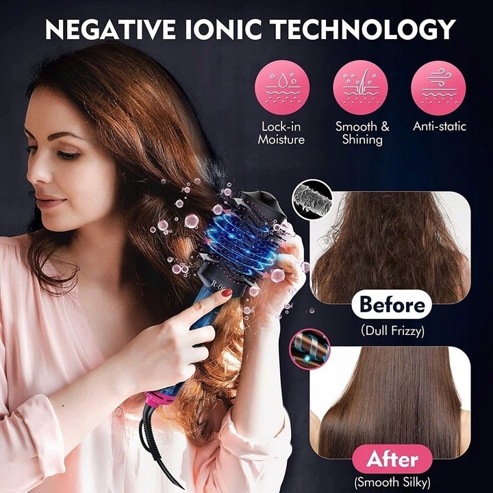 - Wyposażona w generator jonów ujemnych, szczotka do suszarki do włosów uwalnia jony ujemne, aby zneutralizować jony dodatnie we włosach, zmniejszyć puszenie się i ładunek elektrostatyczny oraz sprawić, że włosy będą gładkie i lśniące