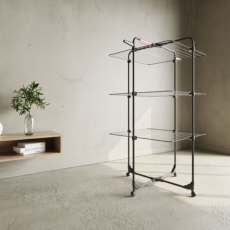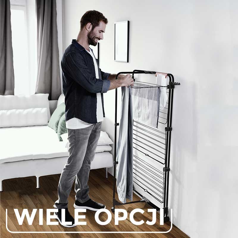 Idealne rozwiązanie do niedużych mieszkań. Matowy czarny kolor sprawia, że suszarka wygląda niezwykle nowocześnie i elegancko, a przy tym jest bardzo funkcjonalna.