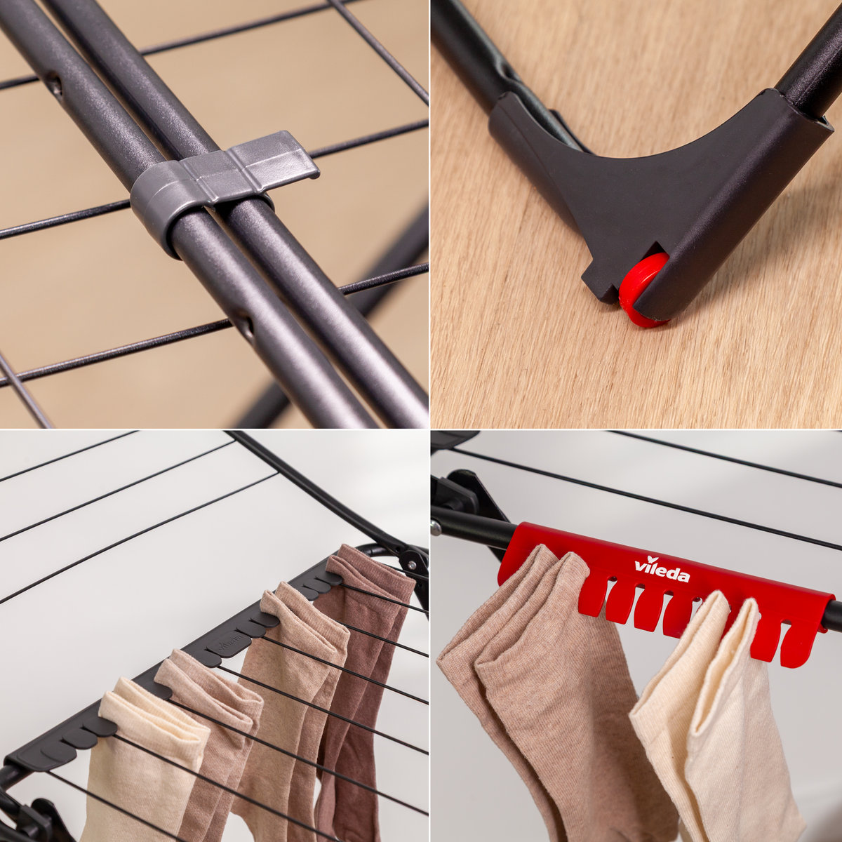 Suszarka do ubrań Vileda Universal Ultimate została wyposażona w przydatny dodatek – dwa wygodne uchwyty na skarpetki w eleganckim czerwonym kolorze. Uchwyty idealnie nadają się do suszenia mniejszych elementów garderoby, takich jak skarpetki i bielizna, co pomaga maksymalnie wykorzystać przestrzeń.
