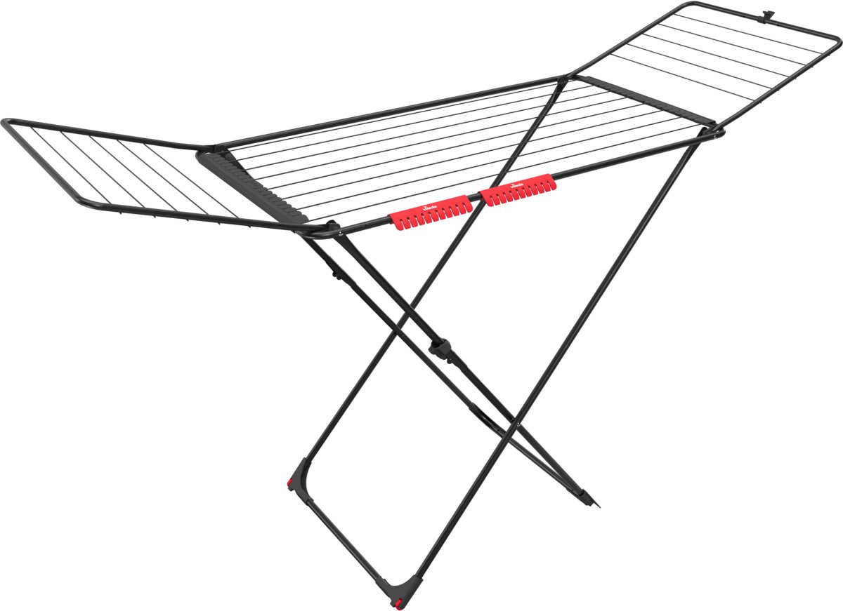 Składane nogi w kształcie litery X sprawiają, że rozkładanie suszarki jest niezwykle proste. Specjalna blokada zabezpiecza ją przed przypadkowym rozłożeniem. Wyposażona również w blokadę skrzydeł. Solidny stalowy stelaż zapewnia trwałość i stabilność. Zaprojektowana z myślą o wygodzie użytkownika, rozkłada się w kilka sekund i równie łatwo się składa.