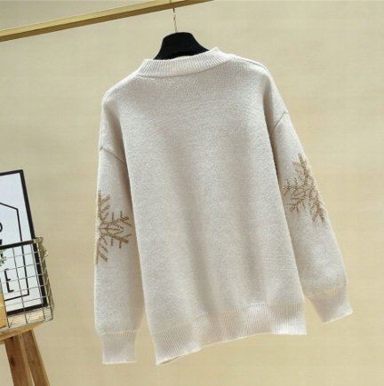 Uroczy, gruby sweter damski z ozdobnym reniferem i śnieżynkami.
