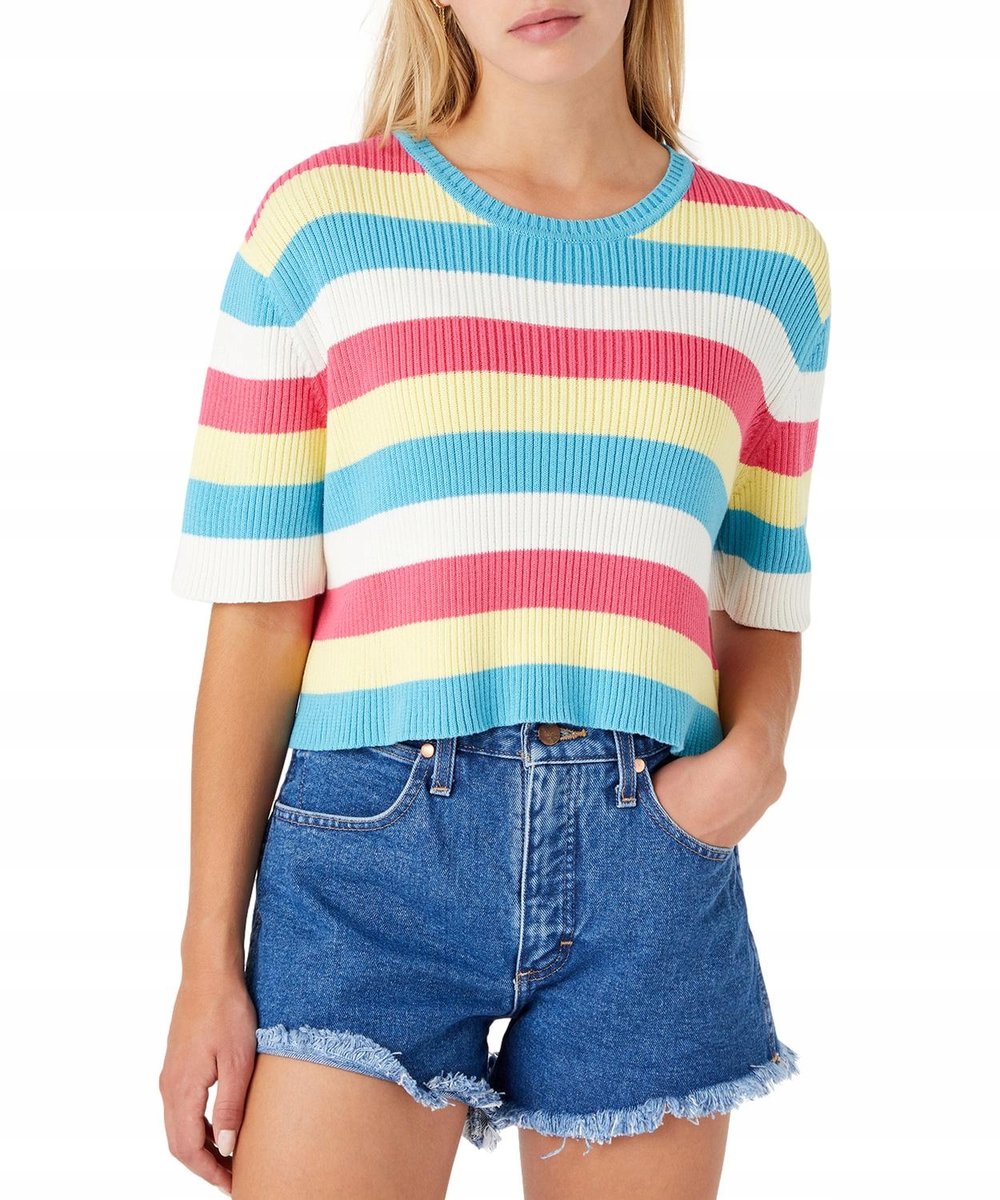 Rozjaśnij swój strój dzięki odważnemu, tęczowemu swetrowi z kolorowym wzorem w paski i przyciętym fasonem. Jest idealny do łączenia z jeansami z wysokim stanem. Skład: 100% bawełna.