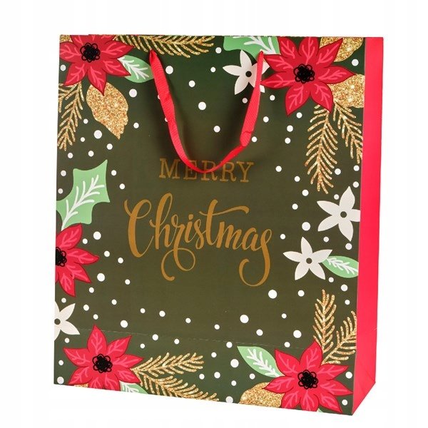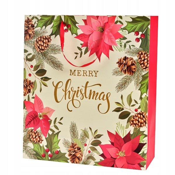 Świąteczna torba prezentowa wykończona uchwytem z wstążki. Idealnie sprawdzi się do szybkiego i efektywnego pakowania prezentów.