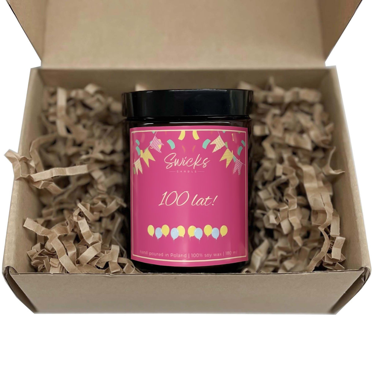 Idealny prezent na urodziny. Świeca zapachowa sojowa w pudełku na urodziny z napisem Sto Lat.