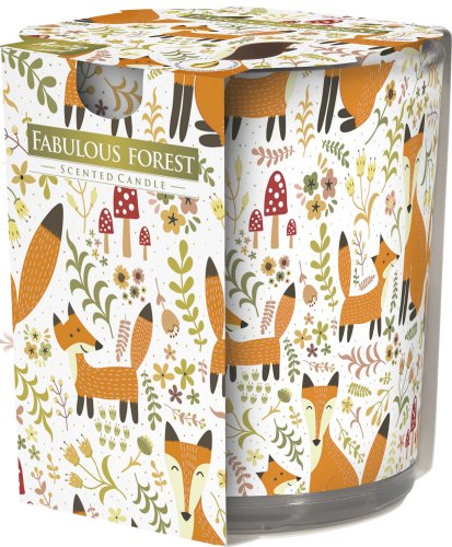 Świeca zapachowa w szkle, ozdobiona folią z motywem bajkowy las oraz czasem palenia do 22 godzin BISPOL.