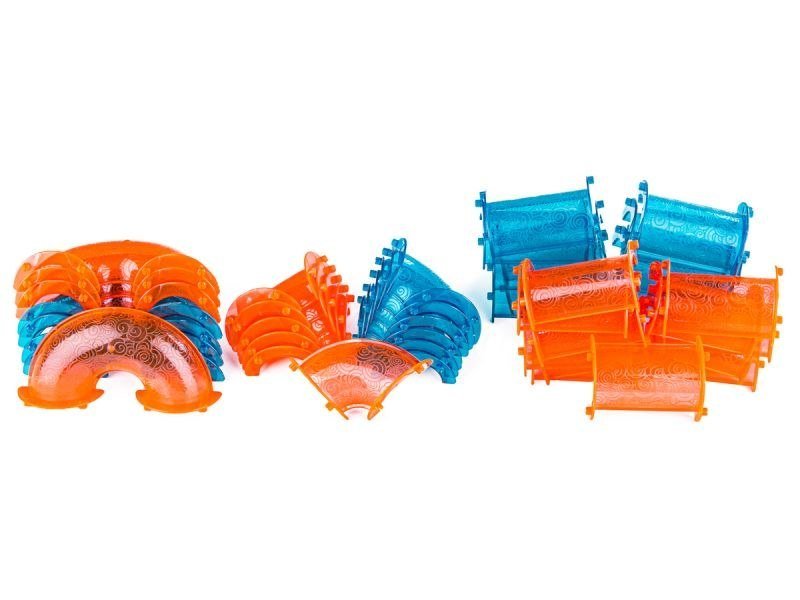 Zestaw składa się z wielu kolorowych części i pozwala na budowanie toru dla kulek o dowolnym układzie.