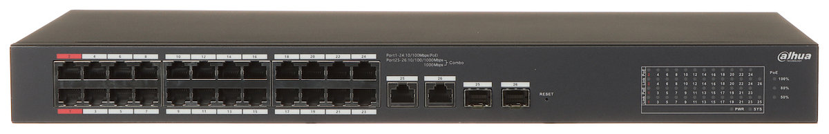 SWITCH POE CS4226-24ET-375 24-PORTOWY SFP DAHUA Dzięki niezawodności i zapewnieniu wysokiej jakości transmisji, 24-portowy przełącznik PoE CS4226-24ET-375 10/100 Mb/s typu desktop stanowi idealne ...