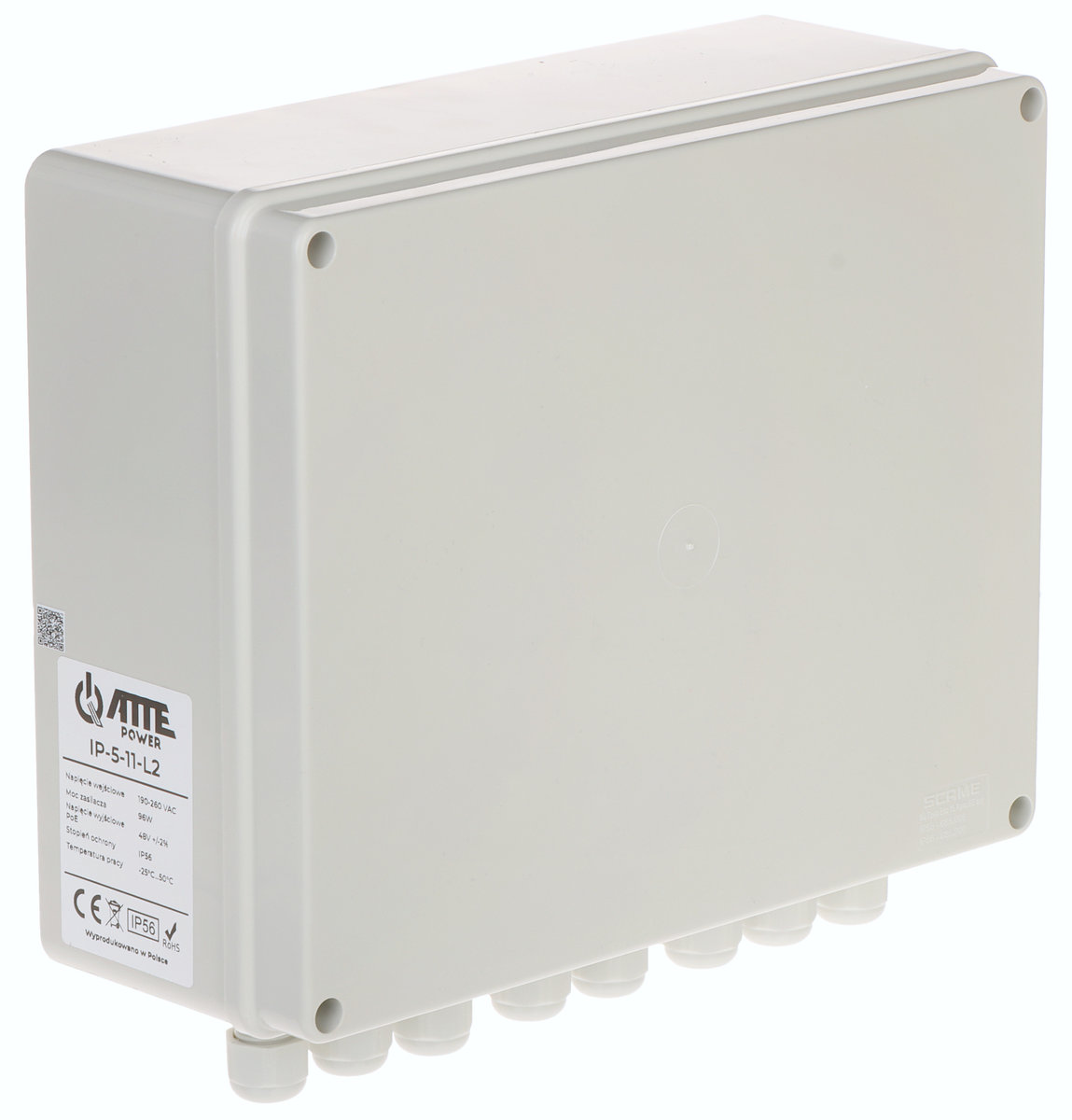 Zestaw IP-5-11-L2 składa się z modułu switcha XPOE-6-11-OF oraz zasilacza impulsowego APS-90-480-OF zamkniętych w obudowie zewnętrznej ABOX-L2 o klasie szczelności IP56.