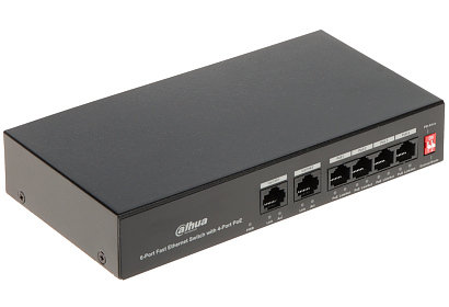Dzięki niezawodności i zapewnieniu wysokiej jakości transmisji, 4-portowy przełącznik PoE PFS3006-4ET-36 10/100 Mb/s typu desktop stanowi idealne rozwiązanie do rozbudowy domowej lub biurowej sieci Cztery porty obsługują funkcję Power over Ethernet (PoE)