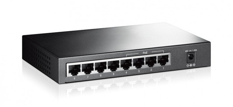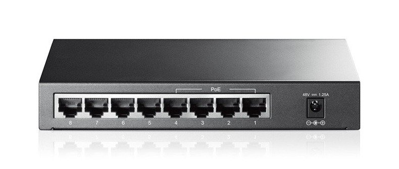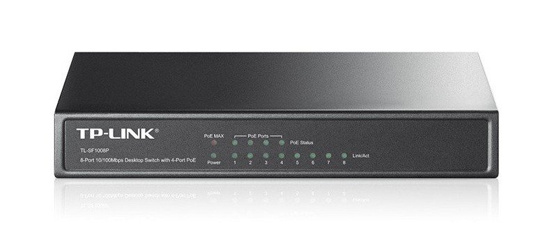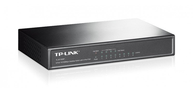 Przełącznik PoE TL-SF1008P posiada 8 portów RJ45 o prędkości 10/100Mb/s, nie wymagających konfiguracji. 4 z nich (1-4) obsługują funkcję Power over Ethernet (PoE). Przełącznik automatycznie wykrywa urządzenia PD działające w standardzie IEEE 802.3af i zaopatruje je w energię. Pozwala to rozszerzyć zasięg sieci w miejscach, w których nie ma dostępu do gniazd lub linii zasilających, a gdzie istnieje potrzeba umieszczenia punktów dostępowych, kamer IP, telefonów IP, itp.