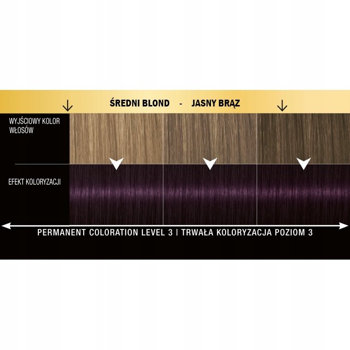 Odcień 3-33 Bogata Śliwka to efektowny głęboki fiolet z ciemnymi purpurowymi refleksami. Odcień odpowiedni do włosów od średniego blondu po jasny brąz. Efekt koloryzacji zależy od wyjściowego koloru włosów. Odcień trwały (poziom 3).
