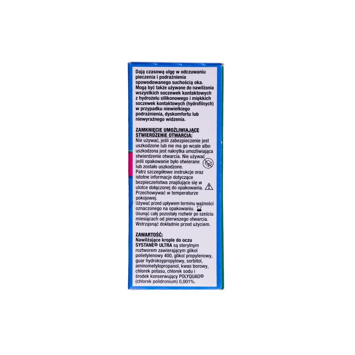 Systane Ultra krople nawilżają powierzchnię oczu dając szybkie, długotrwałe zmniejszenie objawów uczucia suchości, podrażnienia, pieczenia, kłucia, uczucia piasku lub ciała obcego spowodowanych czynnikami środowiskowymi takimi jak kurz, dym, ozon, promieniowanie UV, suche ciepło, klimatyzacja, wiatr, przeciągi, kosmetyki albo zmniejszenie częstotliwości mrugania spowodowane długotrwałym oglądaniem telewizji lub wytężoną pracą przy ekranie komputera.