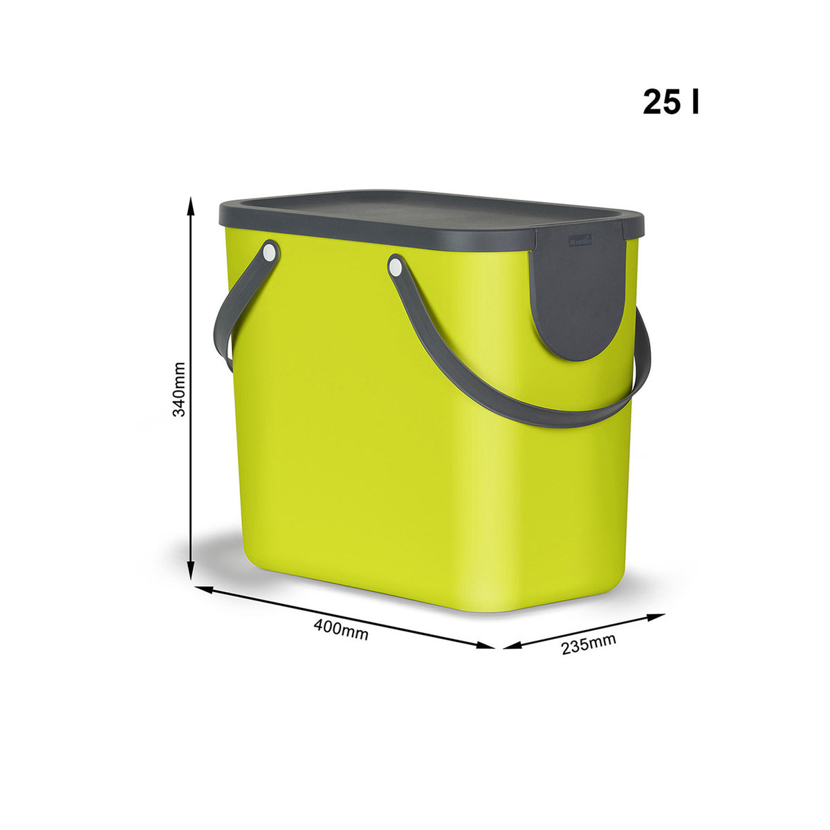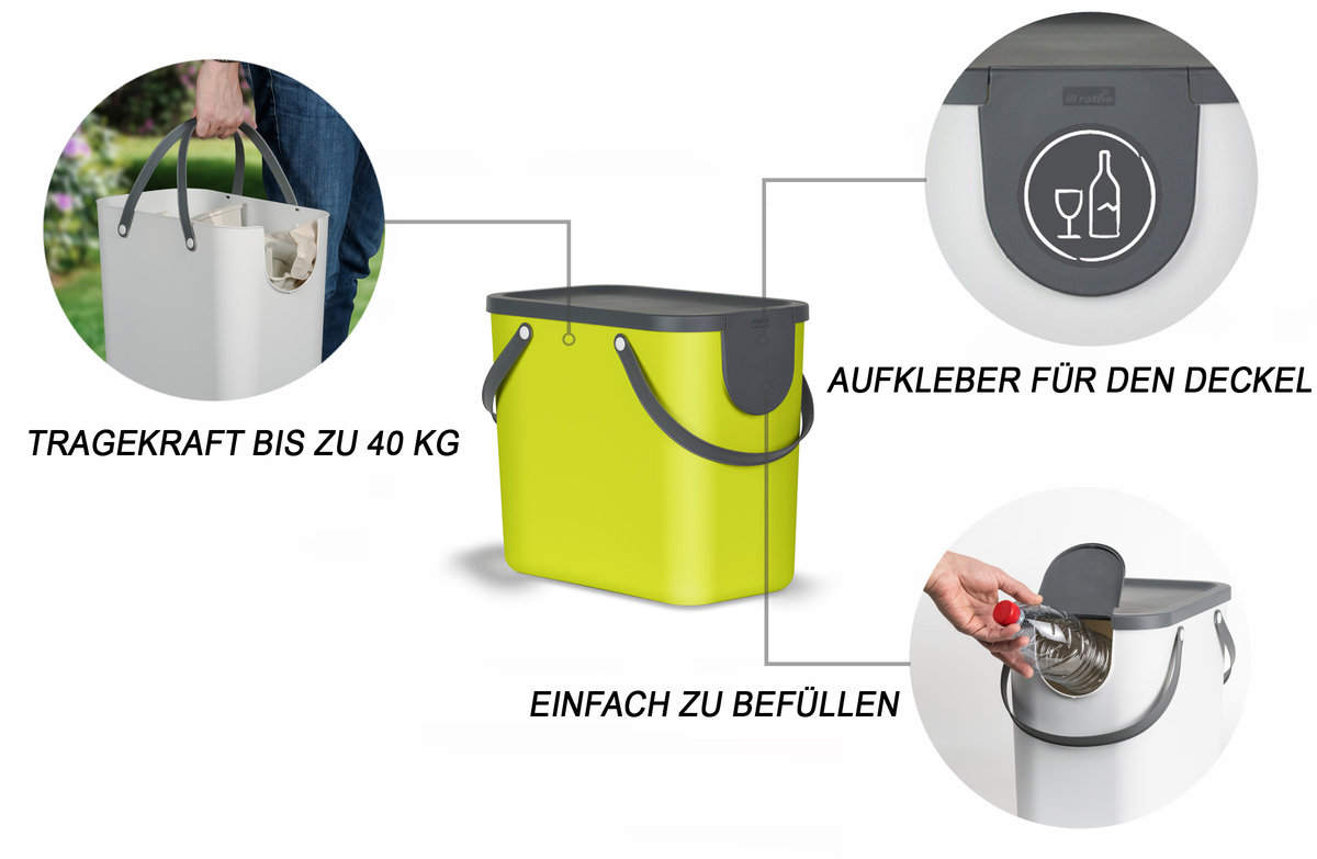 Dzięki dobrze przemyślanemu systemowi segregacji, możesz zobaczyć co należy wyrzucić do którego kosza na śmieci. Gwarantują to naklejki na froncie pokrywy, które są opatrzone różnymi nadrukami. Wystarczy rzut oka na kosz na śmieci i wiesz, dokąd trafiają butelki PET lub do którego pojemnika należy wyrzucić butelki szklane, lub opakowania papierowe. ALBULA wykonano z plastiku pochodzącego z recyklingu, dzięki czemu zachwyca solidnym wykonaniem. Poszczególne kosze mają pojemność 25 litrów. Dzięki pokrywie kosze na śmieci Rotho można łatwo zamknąć. Wykorzystaj produkt Rotho w kuchni, łazience, biurze.