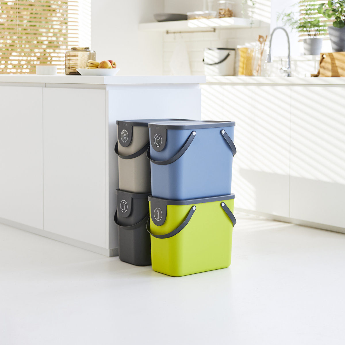 ALBULA 25-litrowy system recyklingu odpadów – sprytna segregacja odpadów w kuchni, łazience i firmie ALBULA to nazwa przemyślanego, modułowego systemu recyklingu firmy Rotho, który może być stosowany