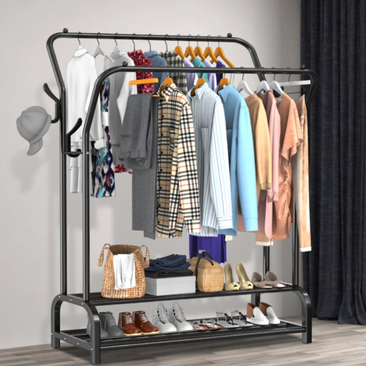 Duża podwójna szafa XXL z wieszakami oraz dwoma dolnymi półkami, ułatwiająca utrzymanie porządku z ubraniami oraz butami. Na dolnych półkach możesz również umieścić kartony czy torebki! Idealnie sprawdzi się w sypialni jak i garderobie. Solidna konstrukcja pozwoli na przechowywanie dużej ilości ubrań, a jego elegancki wygląd sprawi, że będzie on stylową ozdobą w Twoim domu. Dzięki bocznym wieszakom zyskujesz dodatkowe miejsce do przechowywania, możesz na nich zawiesić czapki, szaliki czy torebki!
