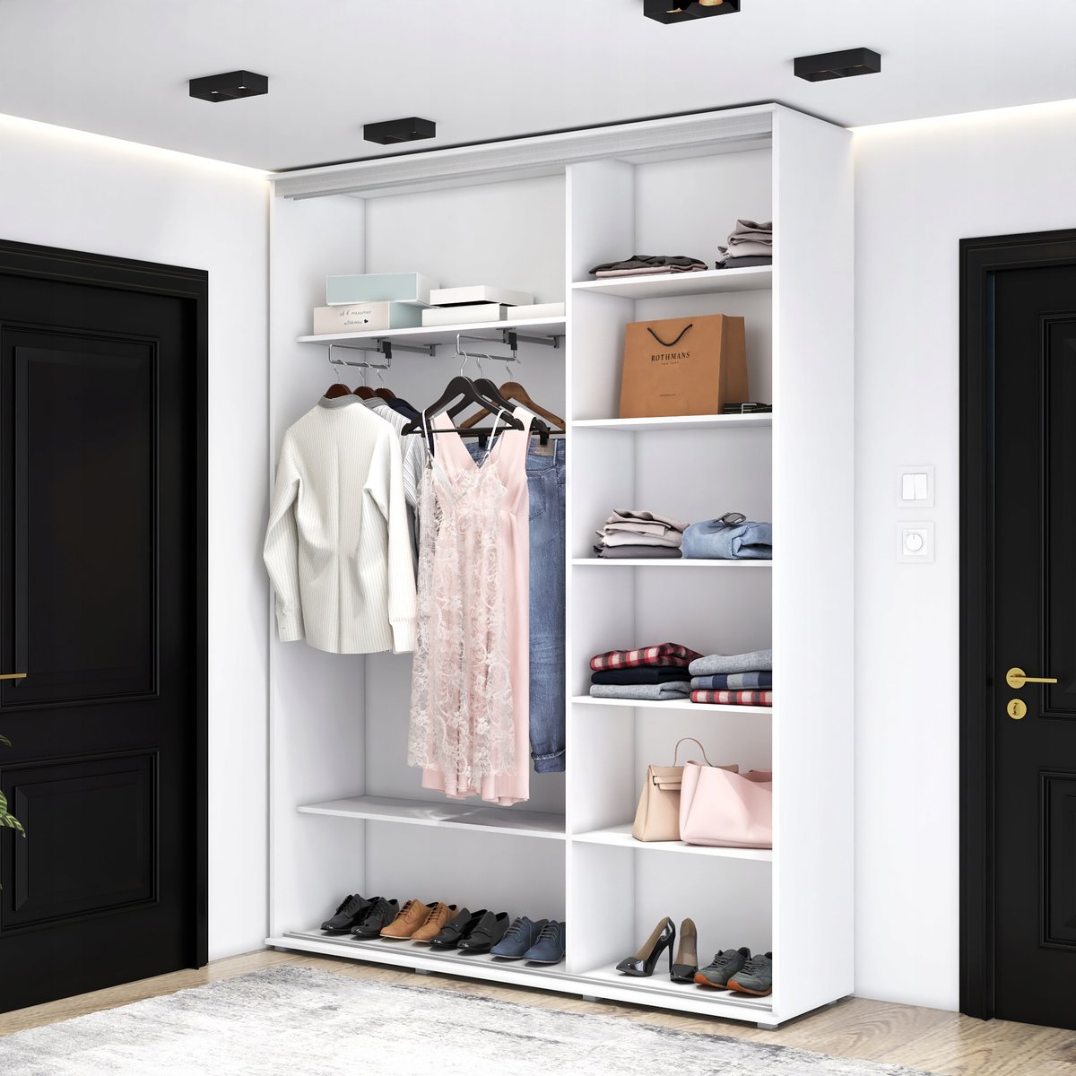 Szafa LORIS posiada w środku 7 pojemnych półek oraz drążek wysuwany na wieszaki.