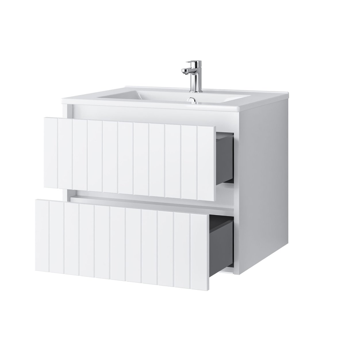 Zestaw Melito 60 cm to doskonały wybór dla osób ceniących nowoczesny design oraz wysoką jakość wykonania. Szafka w eleganckim białym, matowym wykończeniu z ryflowanymi frontami przyciąga wzrok i wpasowuje się w różne style aranżacyjne – od skandynawskiego po minimalistyczny.