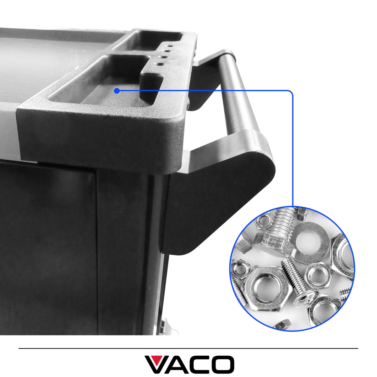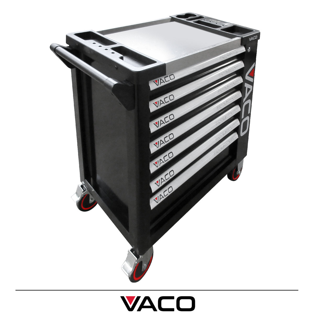 Oferujemy profesjonalny wózek warsztatowy Vaco z 7 przestronnymi szufladami na łożyskach kulkowych oraz stalowym blatem.