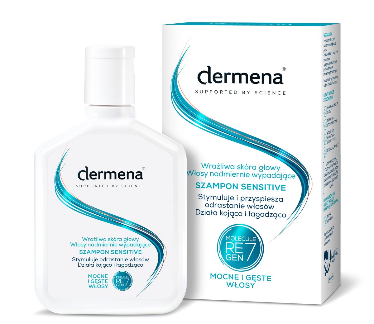 Szampon dermena® SENSITVE łagodnie myje i właściwie pielęgnuje włosy oraz wrażliwą, skłonną do podrażnień i alergii skórę głowy. Nie narusza naturalnej bariery hydrolipidowej naskórka i zapewnia skórze odpowiednie pH. To produkt o delikatnym zapachu, oparty na łagodnych składnikach myjących. Łączy właściwości kojąco-łagodzące z działaniem ograniczającym nadmierne wypadanie włosów i stymulującym ich odrastanie. Przywraca włosom naturalną gęstość i objętość. Wzmacnia włosy i poprawia ich kondycję. Działa naprawczo i regenerująco na cienkie i osłabione włosy, odbudowując naturalną otoczkę włosa i ograniczając tendencję do łamania i rozdwajania się końcówek. Sprawia, że włosy stają się gładkie, miękkie i przyjemne w dotyku. Nie obciąża włosów.