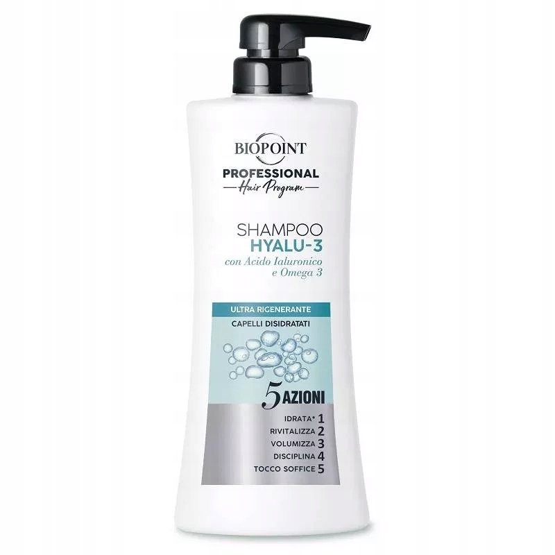 Szampon Hyalu-3 firmy Biopoint Professional to idealne rozwiązanie, które nada nowej witalności i dobrego samopoczucia odwodnionym i suchym włosom. Dzięki formule wzbogaconej kwasem hialuronowym i omega 3 szampon ten oferuje 5 działań zapewniających profesjonalne rezultaty.