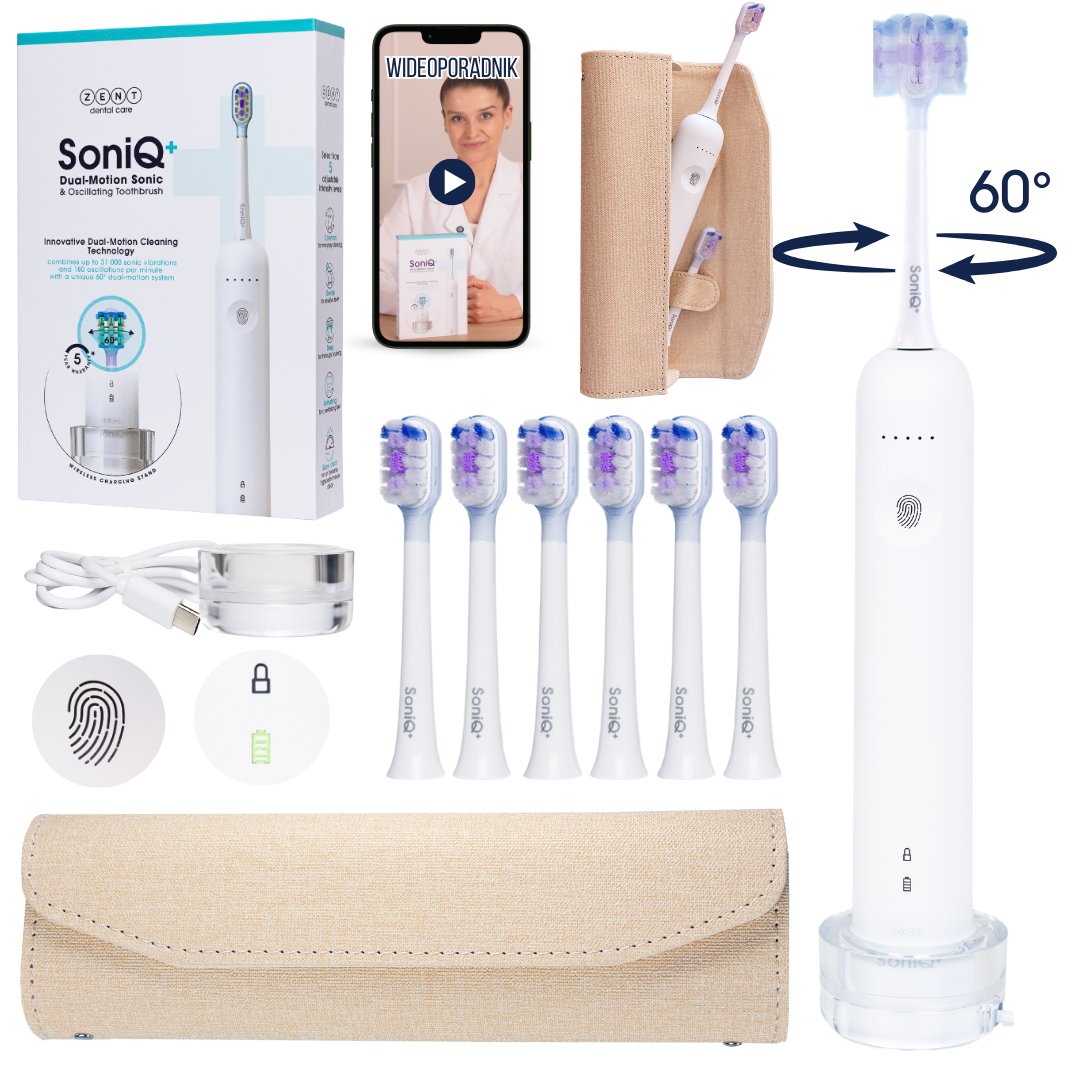 Szczoteczka obrotowo soniczna do zębów SoniQ+ 60° + etui i końcówki 6szt.Co znajdziesz w zestawie?ZENT SoniQ+ - Szczoteczka soniczna 60° Dual MotionZENT SoniQ+ Case Sand LinenZENT SoniQ+ ...