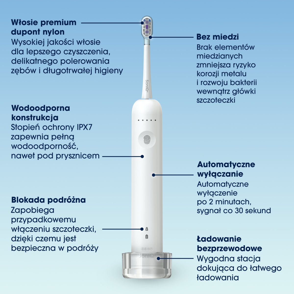 ZENT SoniQ+ to doskonały wybór dla osób, które szukają efektywnej i jednocześnie łatwej w użyciu szczoteczki do zębów. Niezależnie od tego, czy koncentrujesz się na utrzymaniu ogólnego zdrowia jamy ustnej, lub potrzebujesz skutecznego rozwiązania do usuwania płytki nazębnej i dbania o dziąsła, ta szczoteczka jest stworzona, aby sprostać Twoim wymaganiom. Dzięki wykorzystaniu zaawansowanej technologii upraszcza proces szczotkowania, co sprawia, że jest idealna do codziennego użytku oraz podróży. Z funkcją wodoodporności IPX7 oraz miękką silikonową osłoną główki szczoteczki, SoniQ+ zapewnia niezawodność i bezpieczeństwo w każdych warunkach użytkowania.