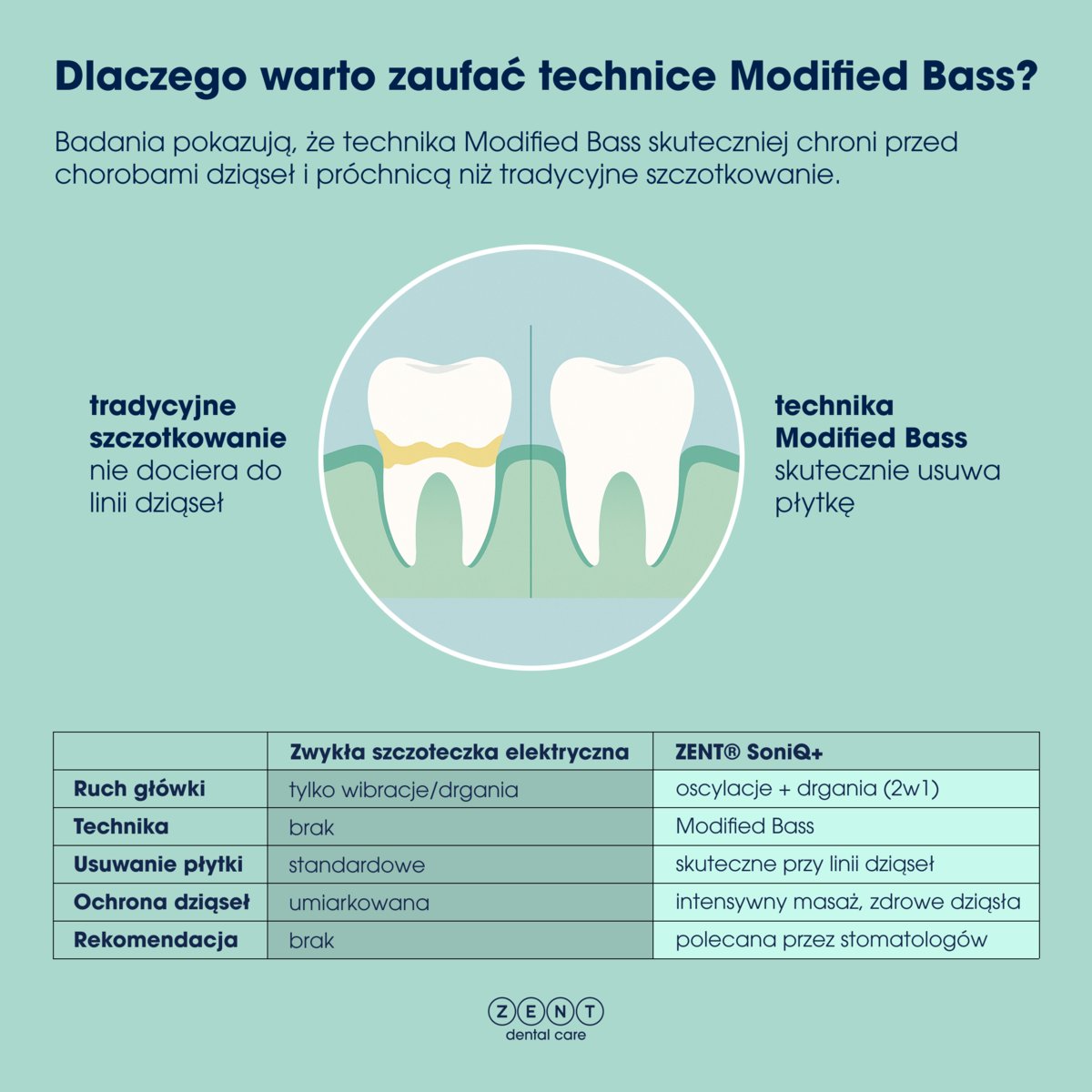 ZENT SoniQ+ wykorzystuje zaawansowaną technologię, by zapewnić wyjątkową pielęgnację jamy ustnej. Dzięki unikalnemu systemowi dual-motion o kącie ruchu 60°, łączy 31 000 wibracji sonicznych i 180 oscylacji na minutę, co zapewnia dokładne, bezpieczne i skuteczne czyszczenie z każdej strony. Dzięki temu szczoteczka pozwala dotrzeć do trudno dostępnych miejsc pod linią dziąseł, jednocześnie chroniąc zęby i dziąsła przed uszkodzeniem.