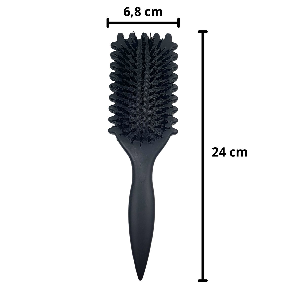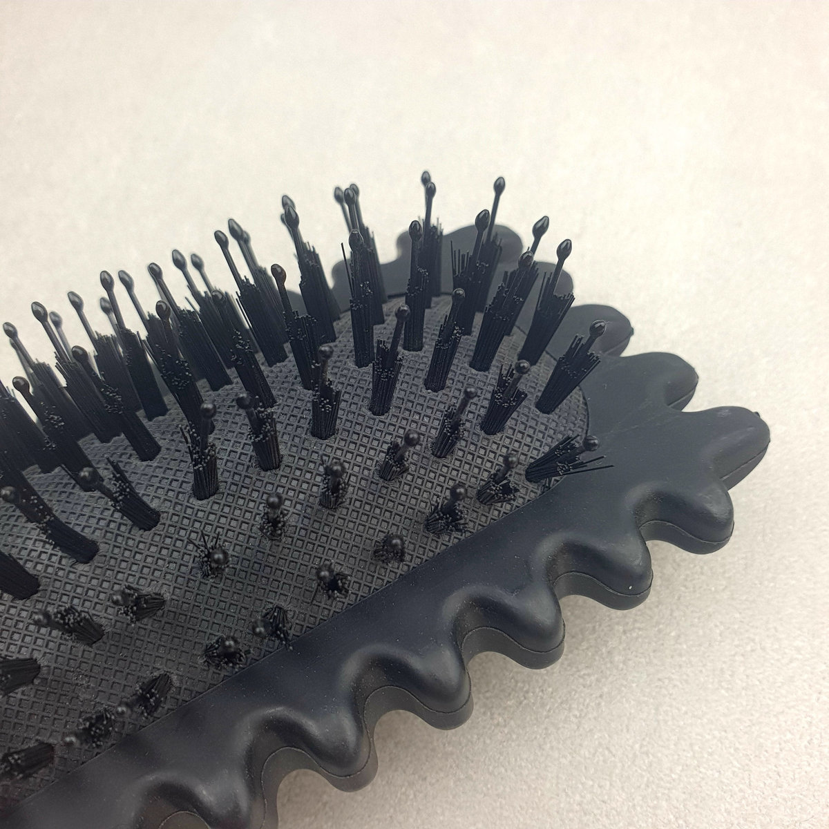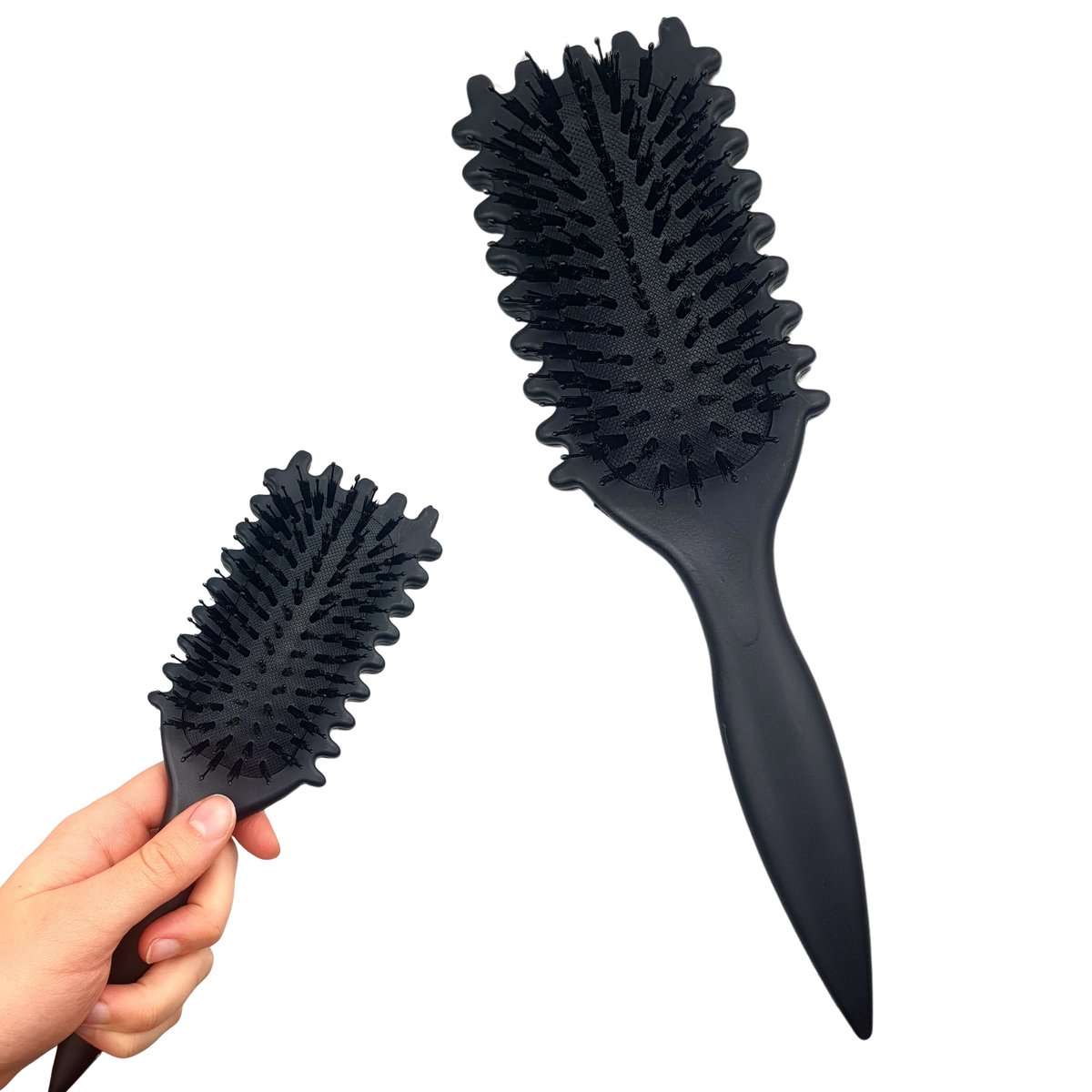 Dzięki naszym czarnym szczotkom do loków Twój fryzjer zyska nowy wymiar stylizacji. Loki i fale to nieodłączny element zarówno klasy, jak i nowoczesnego stylu. Szczotka do włosów kręconych to specjalistyczne narzędzie, zaprojektowane do pielęgnacji i rozczesywania pasm bez naruszania ich struktury. Dzięki elastycznym włosom i miękkim ząbkom, efektywnie rozplątuje włosy, unikając ich puszenia się i łamania. Miękkie kuleczki ochronne na końcówkach ząbków chronią skórę głowy i delikatnie masują, wspierając zdrowie Twoich włosów.