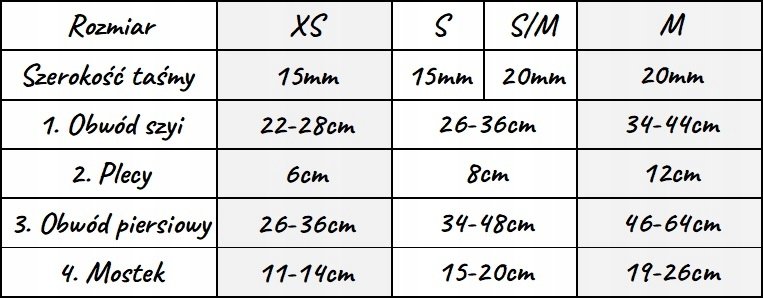 ROZMIAR / SZEROKOŚĆ TAŚMY / OBWÓD SZYI 1️⃣ / PASEK PLECY 2️⃣ / OBWÓD PIERSIOWY 3️⃣ / PASEK MOSTEK 4️⃣