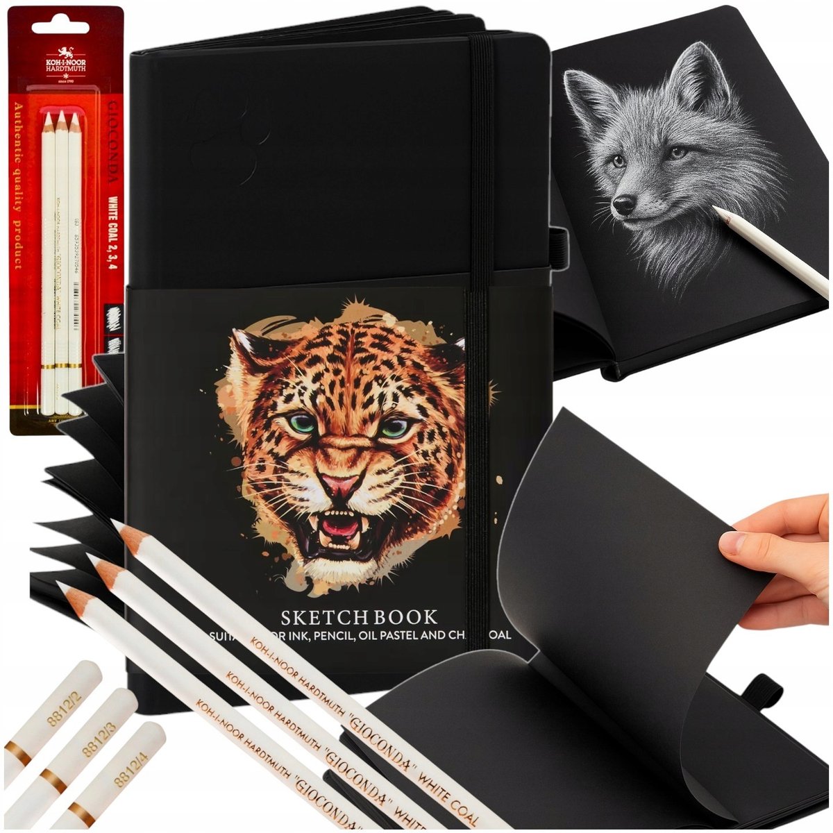 SZKICOWNIK A5 CZARNE KARTKI + WĘGLOWE OŁÓWKI BIAŁE ZESTAW ARTYSTYCZNY PREZENT ✨ ZESTAW DO RYSOWANIA – SZKICOWNIK Z CZARNYM PAPIEREM + WĘGLE BIAŁE KOH-I-NOOR ✨Zestaw ...