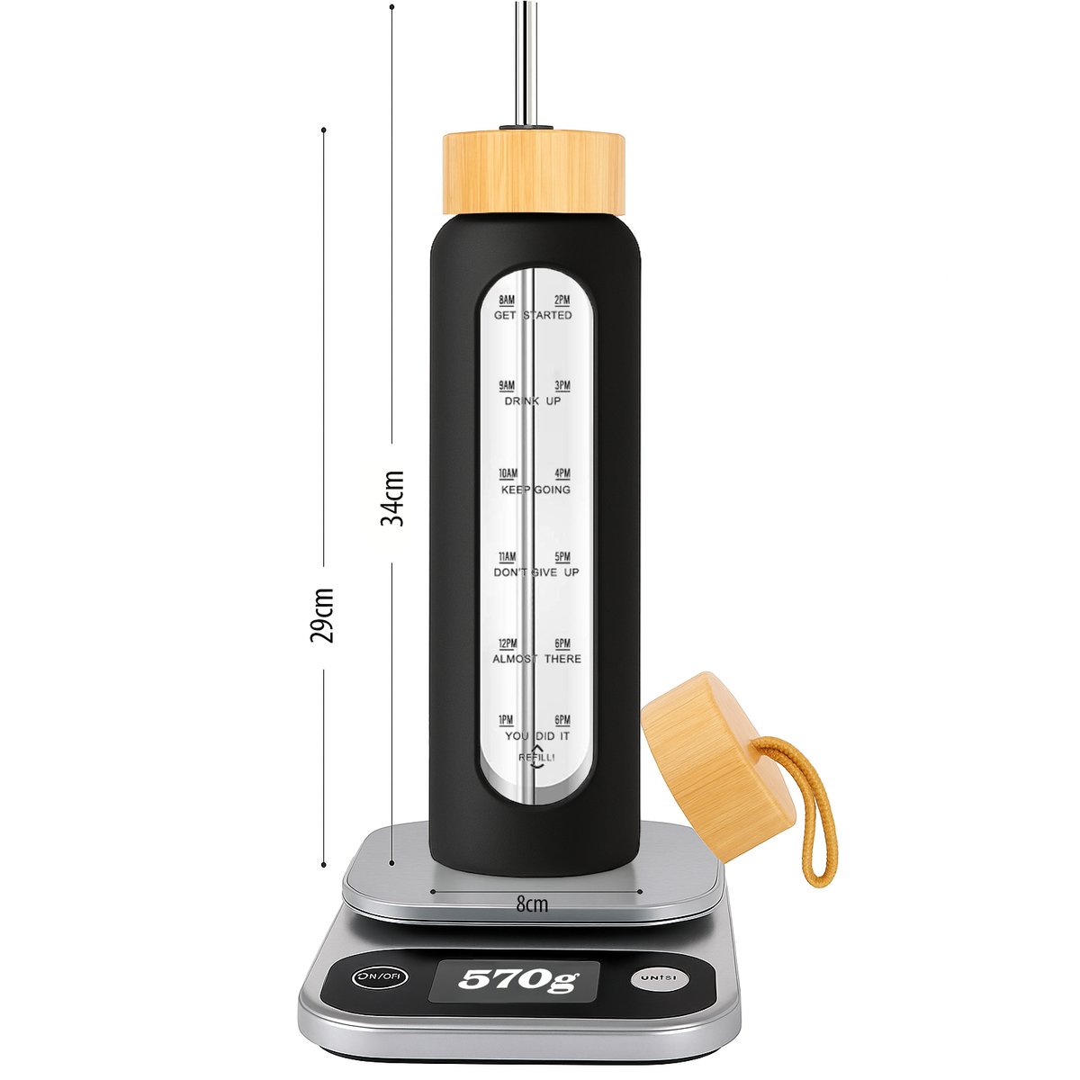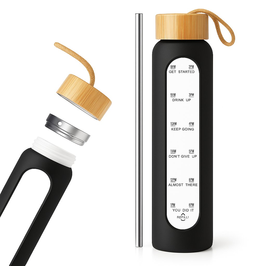 1️⃣Motywacyjna skala czasowa - Butelka posiada czytelne oznaczenia godzinowe od 8:00 do 18:00 z motywującymi hasłami zachęcającymi do regularnego picia wody.