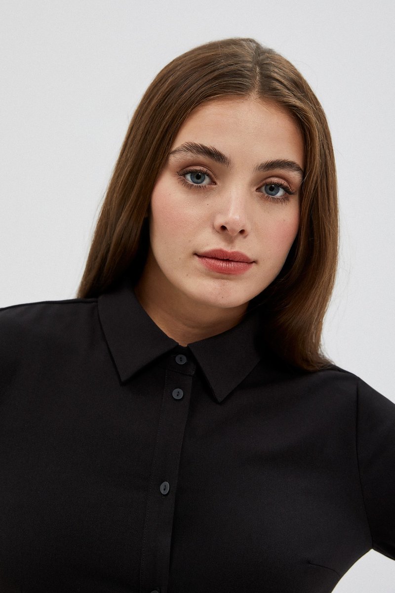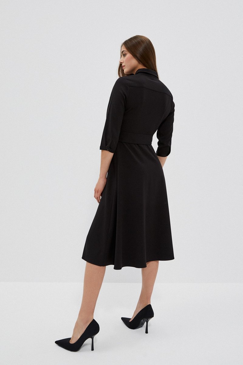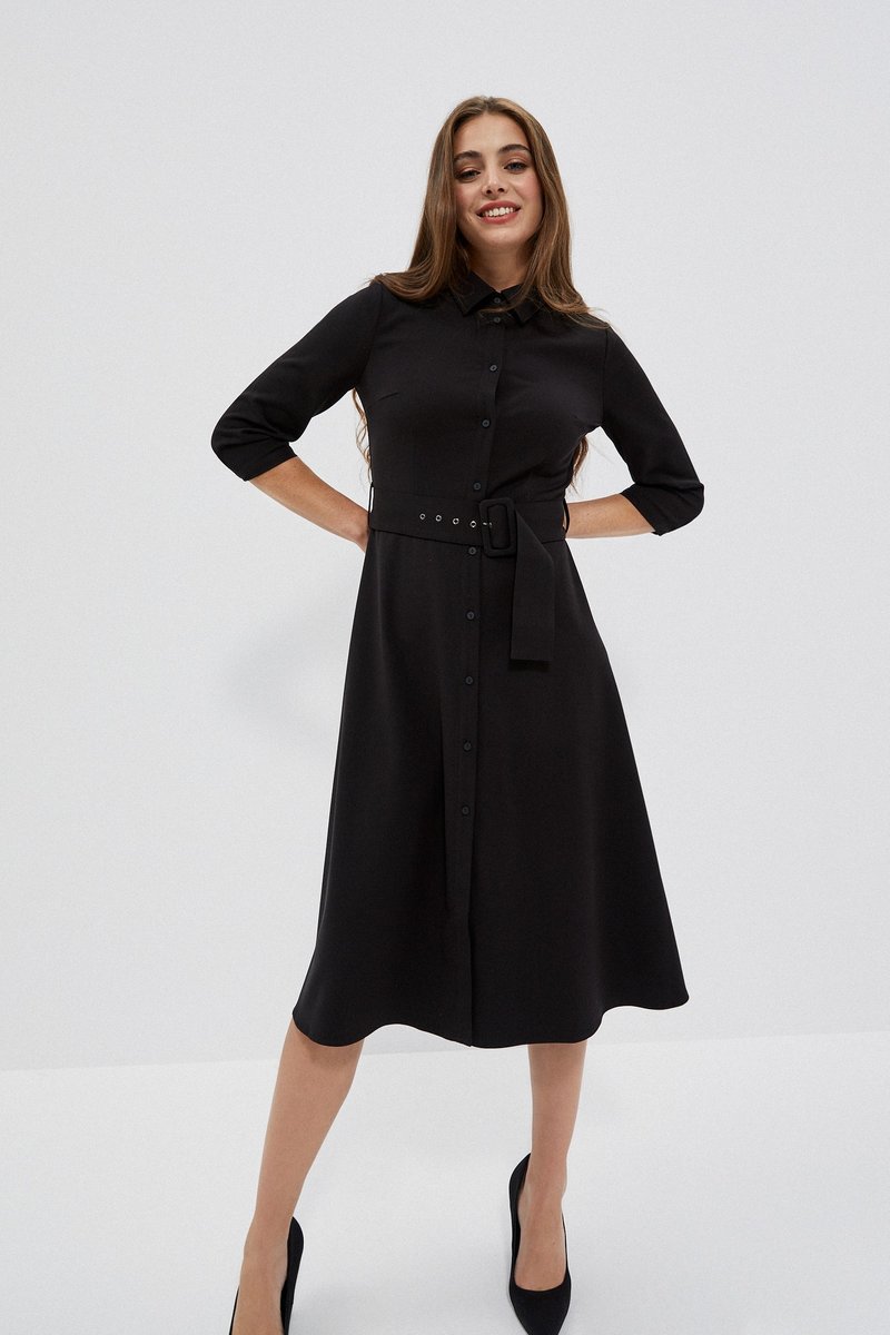 63%POLIESTER, 34%WISKOZA, 3%ELASTAN Czarna szmizjerka z szerokim paskiem. Krój lekko rozszerzany, w literę A. Pod szyją klasyczny kołnierzyk.Rękawy sięgające do łokci. Całość zapinana na guziki. Długość midi, za kolano. Kolor czarny.