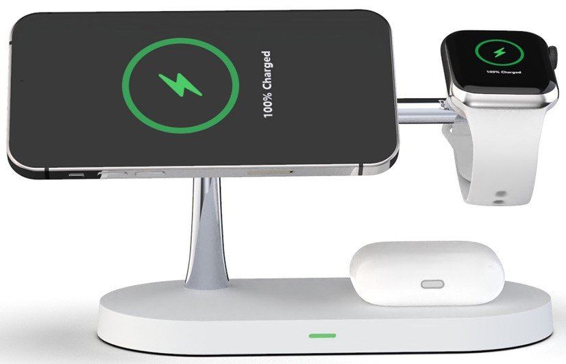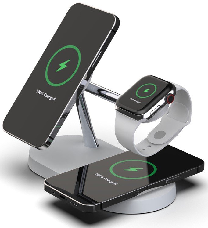 Wielofunkcyjna ładowarka indukcyjna firmy BOUNN umożliwia ładowanie jednocześnie, bądź całkowicie odddzielnie, trzech urządzeń - iPhone’a z funkcją MagSafe ( tylko bezpośrednio do telefonu lub obudowy z oczkiem magnetycznym) / smartfony Android z funkcją ładowania indukcyjnego, Airpodsy i Apple Watch'a.
